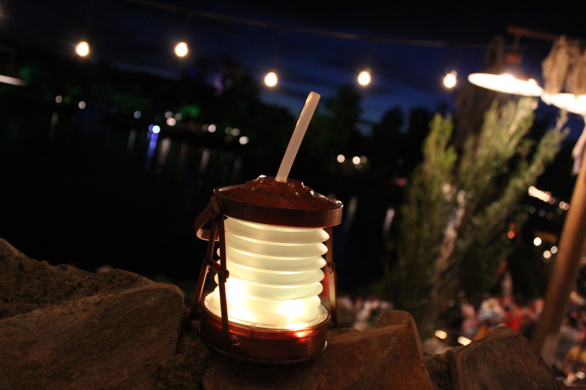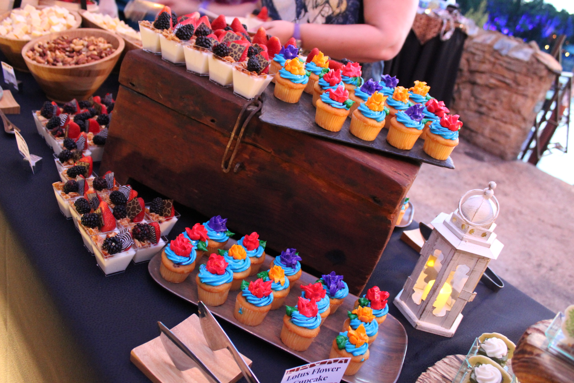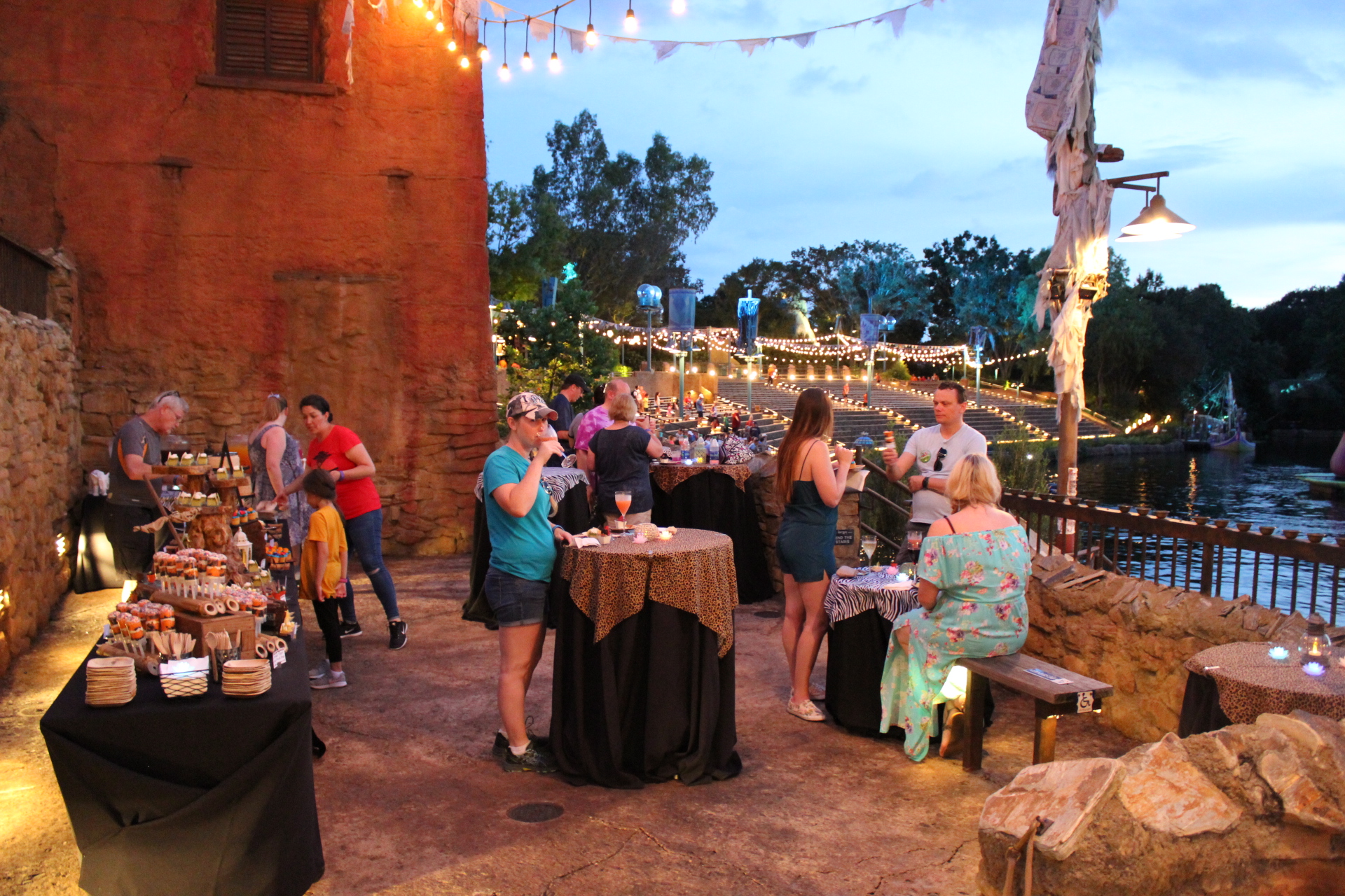 I suggest lining up at least 30 minutes before the dessert party if you want your pick of the tables available, should you decide to watch from there. The event itself starts 1 hour and 15 minutes before a Rivers of Light showing. Ours began at 8pm, so we could enjoy drinks and desserts until the 9:15 show began. For safety, at 9:15, we were asked not to move again until the show was over due to lower light levels in the amphitheater. The cast members gave us plenty of notice before this happened, so we weren’t caught off guard and had plenty of time to make trips back to the dessert station and bar.