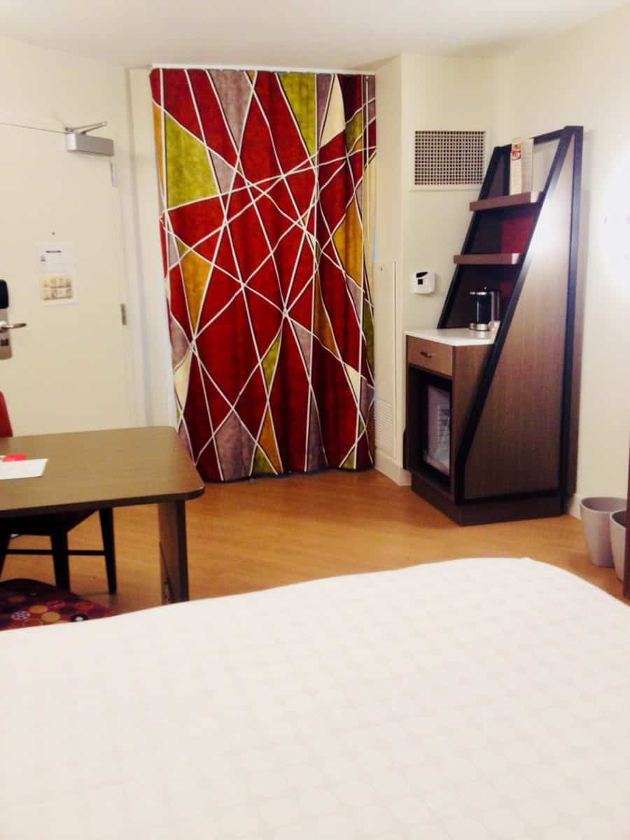 The room opens up to a cute little coffee station, fully stocked with Joffrey’s coffee pods (not Keurig) and Twinings earl grey and decaf green tea. Note the mini-fridge with the clear glass door, a nice upgrade from older mini-fridges.