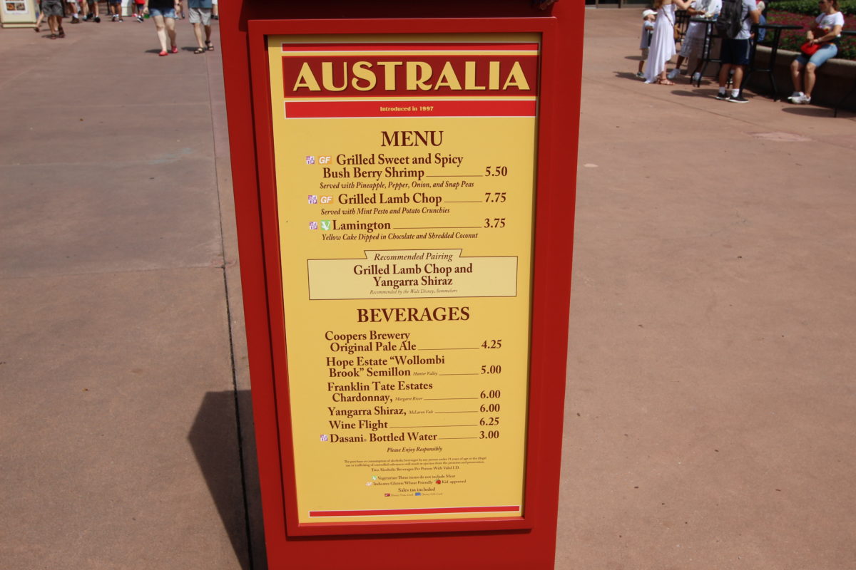 Menu for the Australia Marketplace at the Epcot International Food & Wine Festival