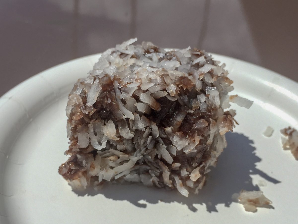 Lamington: Yellow Cake Dipped in Chocolate and Shredded Coconut (V) – $3.75