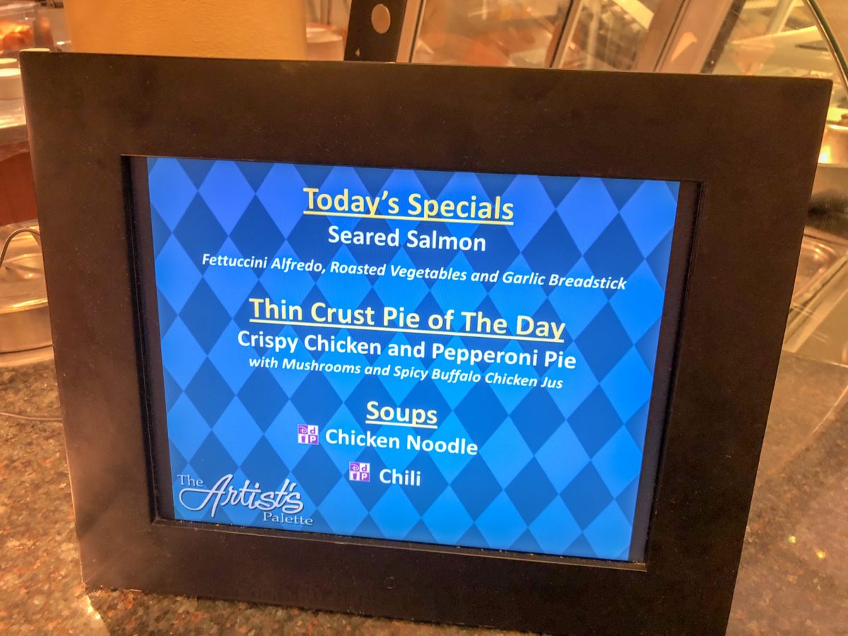 The Artist’s Palette is a quick service food and beverage location located at Disney’s Saratoga Springs Resort & Spa. This location is easily missed by the average guest. With Disney Springs being so close we really can’t blame anyone for not stopping by. You may remember we checked out their amazing birthday cake bread pudding a while ago (which is sadly gone now). We stopped by recently and found a brand new thin crust pizza pies are available.