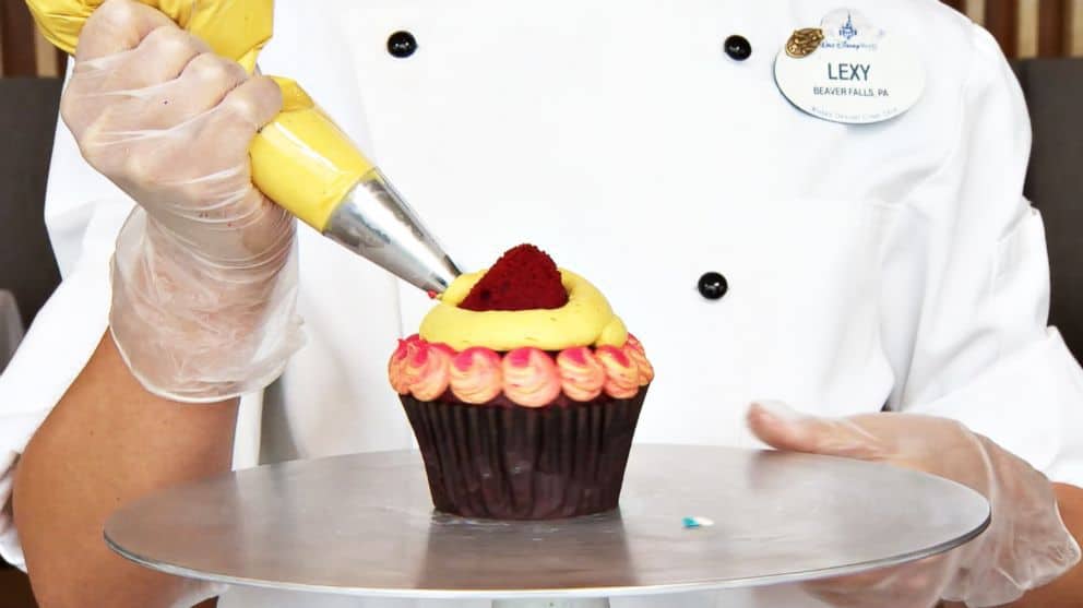 The concept behind the cupcake, as explained by a Disney Pastry Sous Chef, is that the tiny cake on top is Mickey’s birthday cake. (The missing slice is his!)