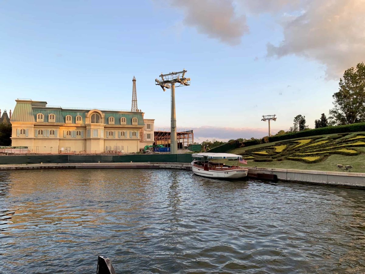 You can see the show building for the Ratatouille ride in the background, with a Skyliner pillar towards the water’s edge.