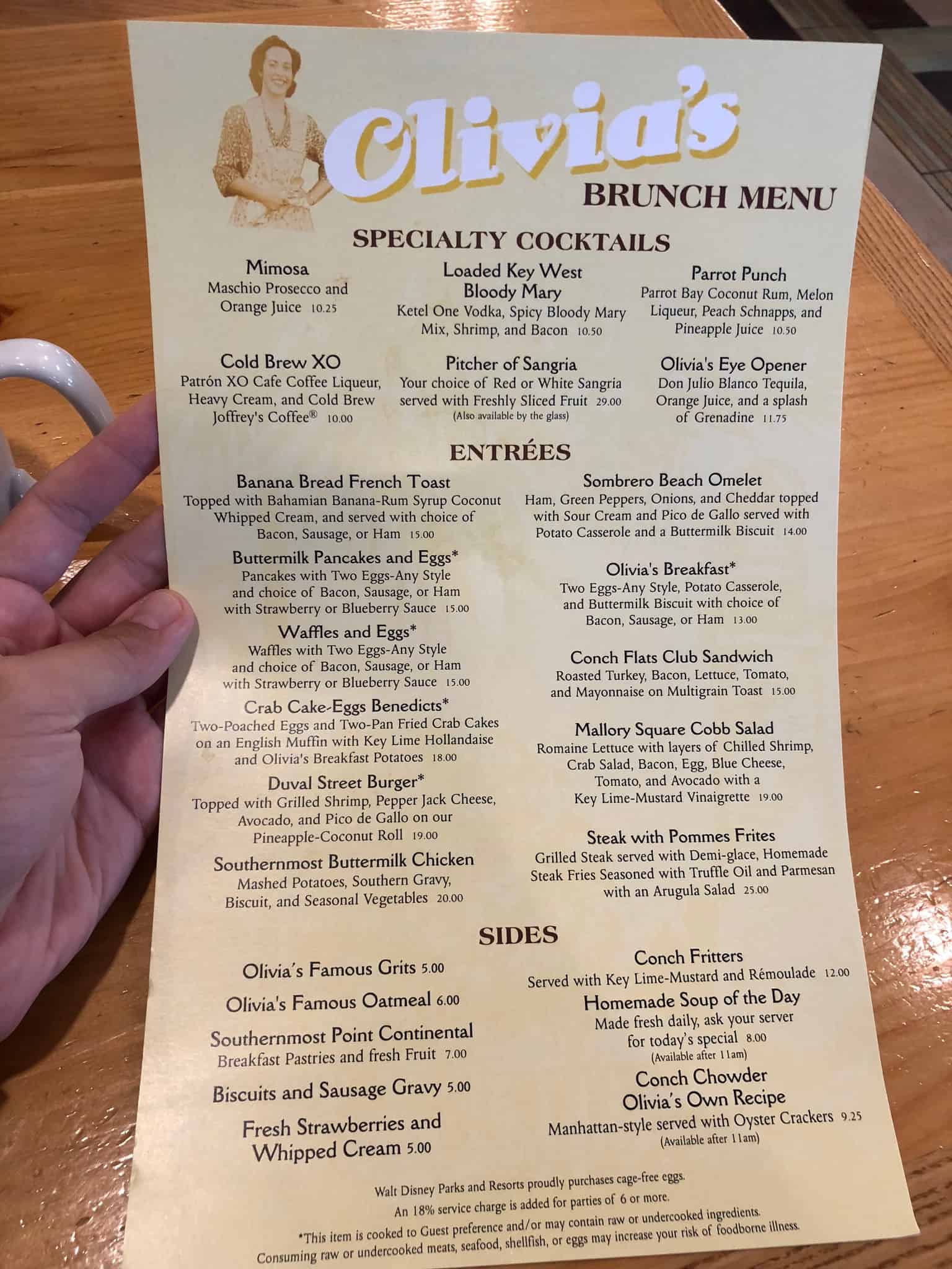 Olivia’s Cafe is a table service restaurant located at Disney’s Old Key West Resort. We love Olivia’s, they have fantastic comfort food for affordable prices, friendly servers, and great drinks. Plus it’s always easy to get a reservation there. You may remember we checked out their fried chicken a little bit ago, it’s still delicious as ever. Recently Olivia’s added a brunch menu containing options from both the breakfast and the lunch menu. This brunch is available on Saturdays and Sunday from 7:30AM through 3:30PM.