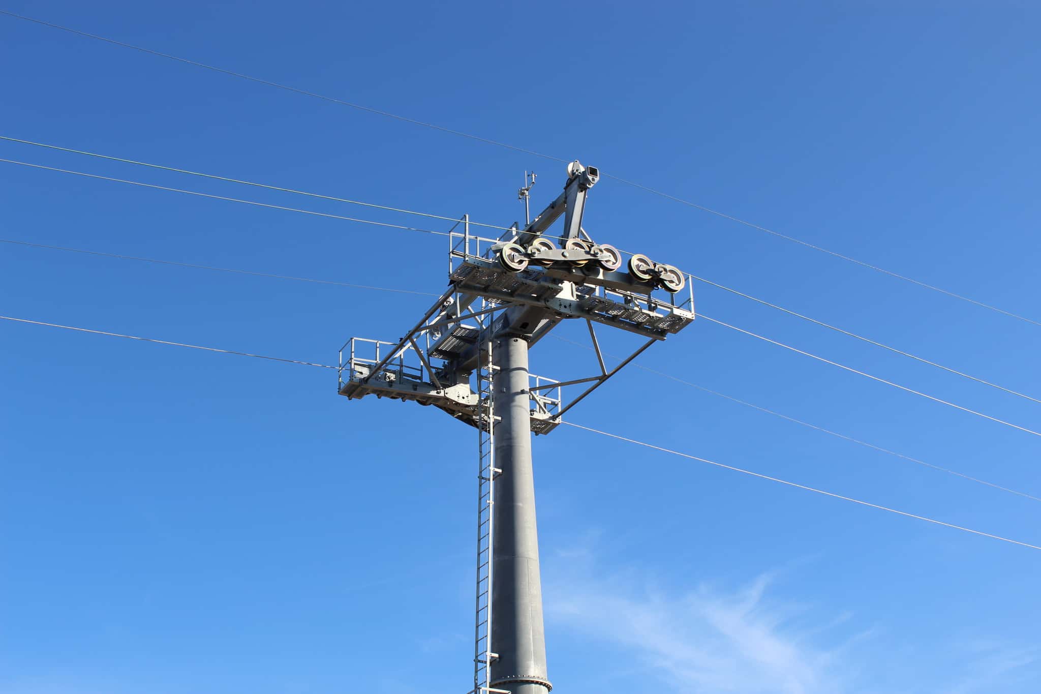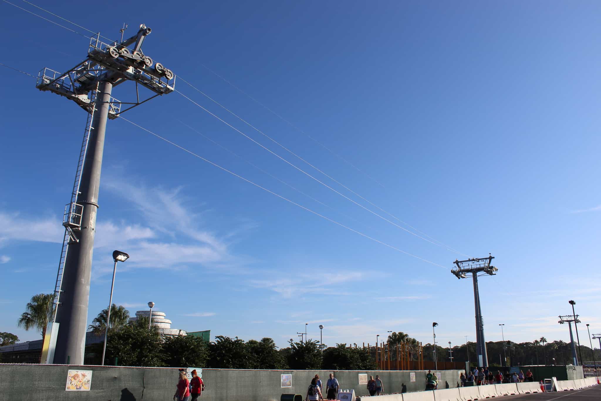 The lowest wires on either side are those that will carry the gondolas from Studios to the main station at Disney’s Caribbean Beach Resort.