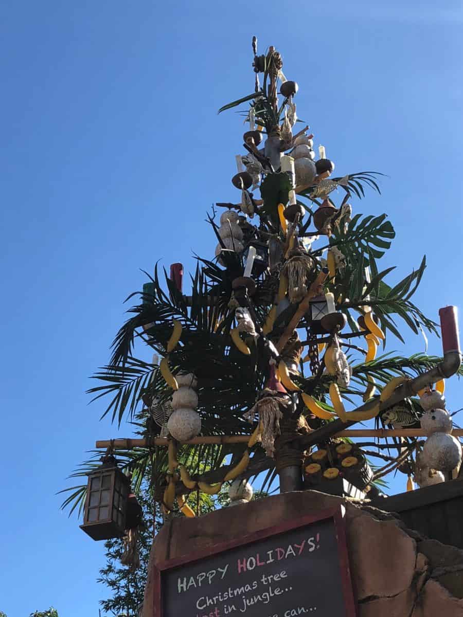 I particularly enjoyed this tree with snowman and banana ornaments above the Jungle Cruise ride.