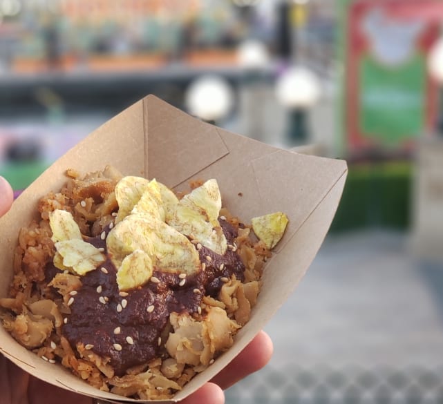 As someone who is passionate about exotic, spicy food, and fairly ambivalent regarding postre, take it to heart when I tell you this is positively the best offering at this particular booth. At home I help myself to additional helpings of Mole until I lose my enthusiasm for dessert, but not here. If you’re into chocolate, save room for this.