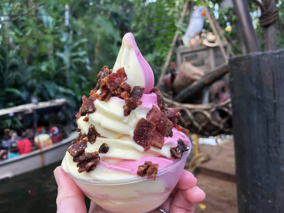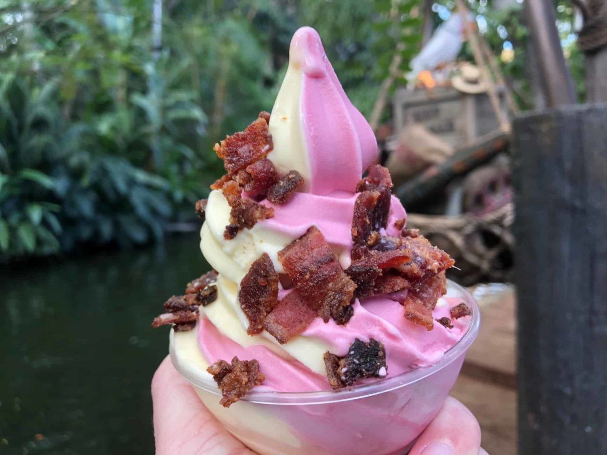 In true SoCal style there is a secret menu option at Disneyland Park’s newest quick service restaurant; The Tropical Hideaway. For an additional 99 cents, guests may top any of their Dole Whips or floats with candied bacon crumbles by asking for it “spiced up”.