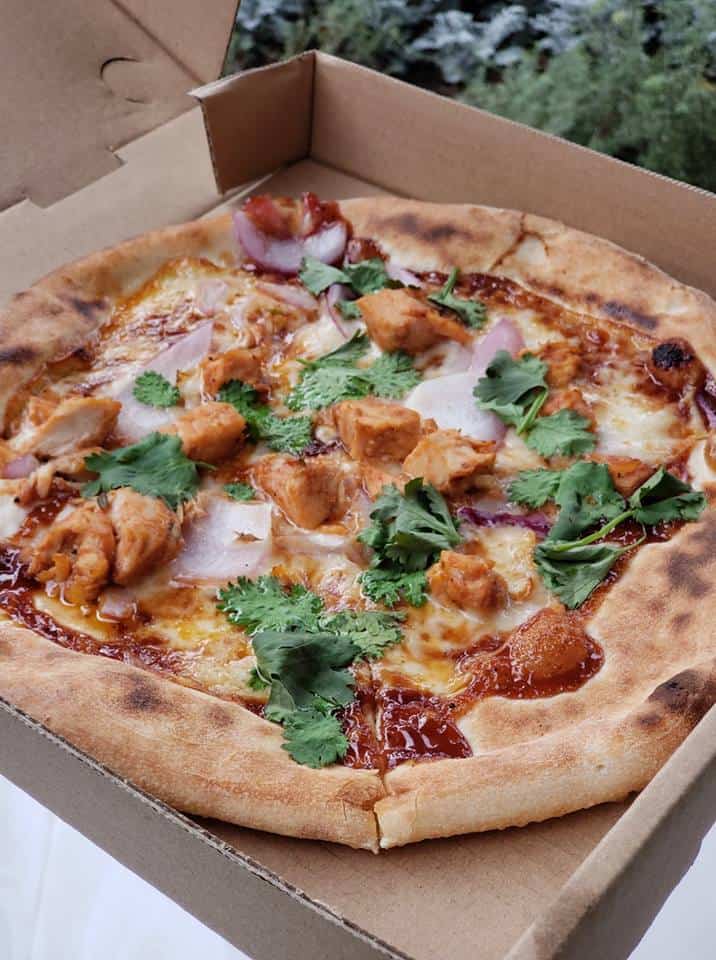 - California: chicken, BBQ sauce, red onions, cilantro, mozzarella, smoked gouda