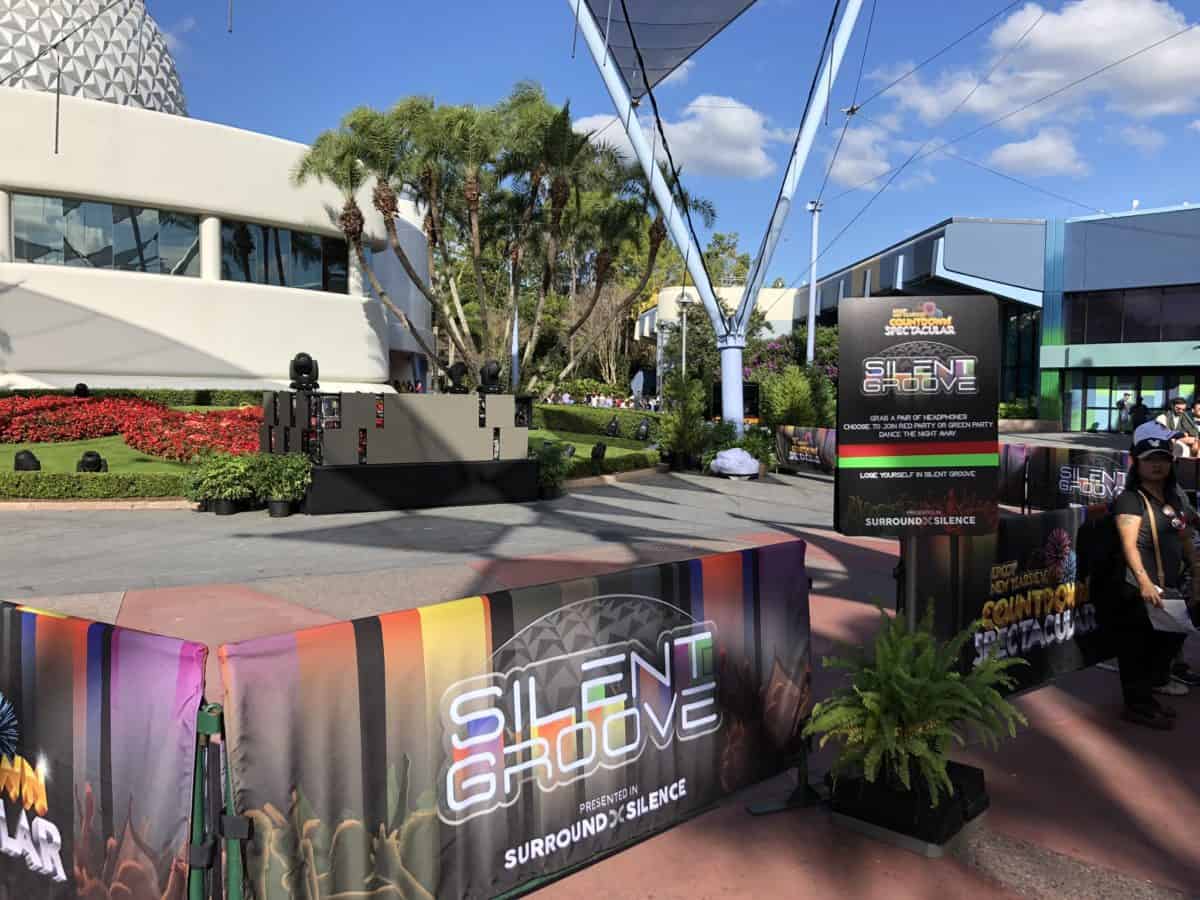 One of the main stages for tonight’s festivities. The countdown clock will be projected behind on Spaceship Earth.