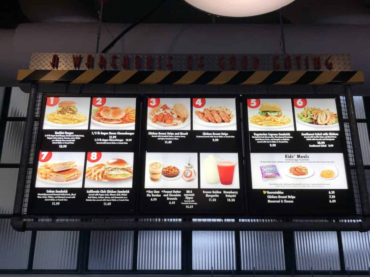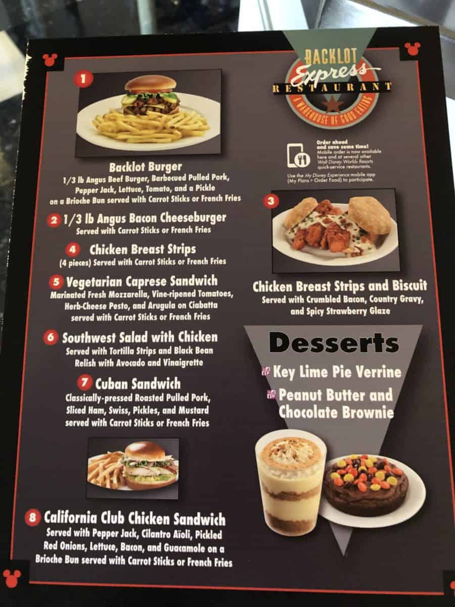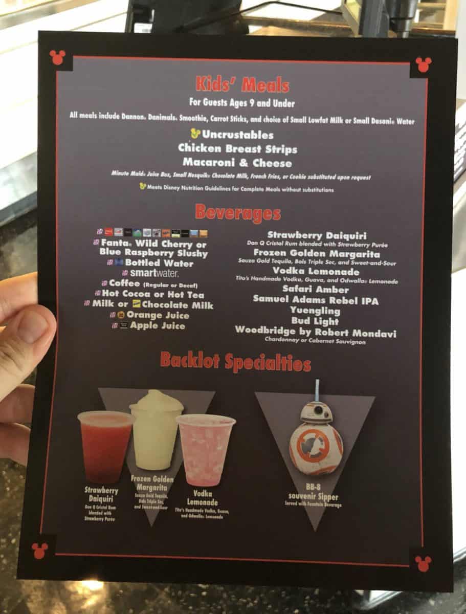 The Backlot Express quick service restaurant at Disney’s Hollywood Studios debuted a brand new menu today. This new menu replaces the old Star Wars themed offerings that had been there for quite a long time.