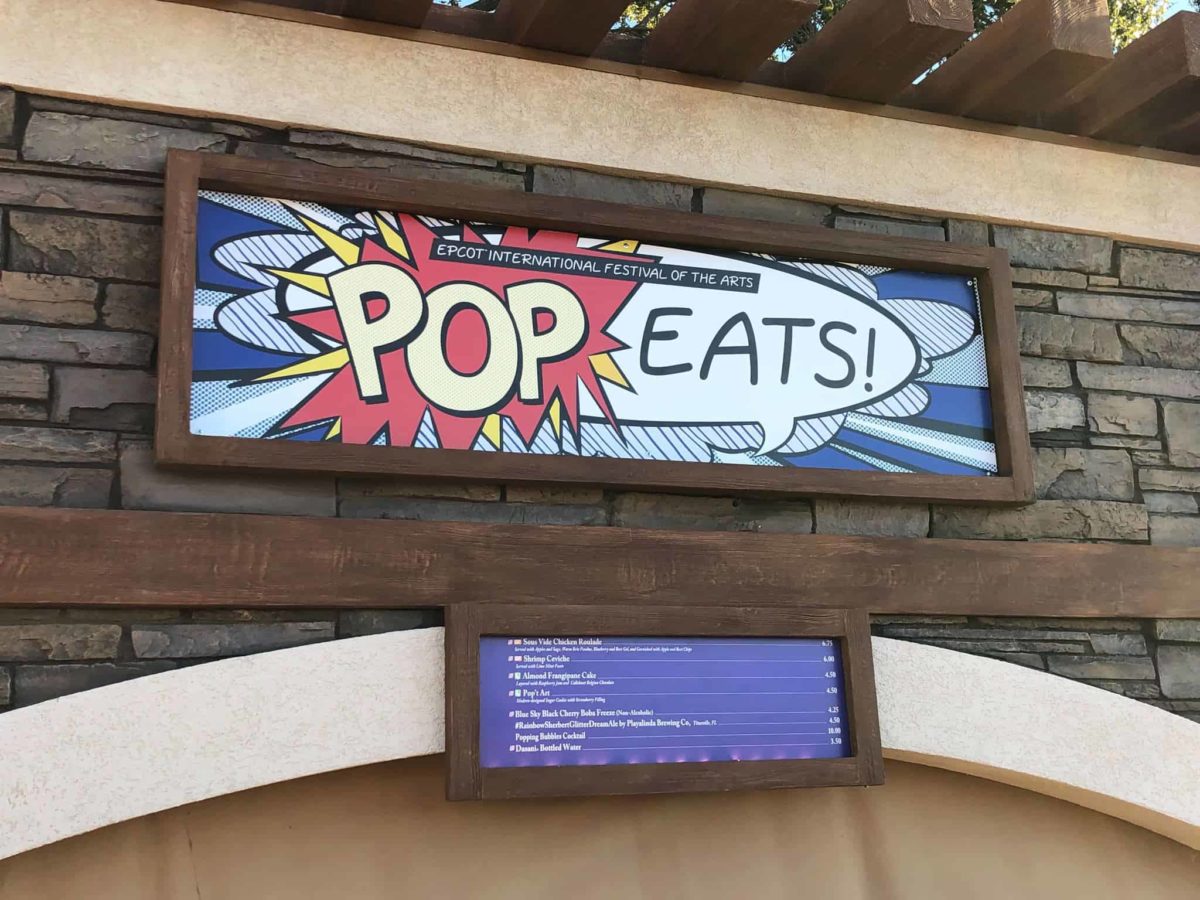 Welcome to a food studio review for the 2019 Epcot International Festival of the Arts, taking place in the park from January 18 to February 25, 2019. This review will cover the “Pop Eats!” Food Studio located at World Showcase Plaza past the Disney Traders shop as you head towards Mexico. (Note that the menu prices do not include tax!) For our complete coverage of the 2019 Epcot International Festival of the Arts, head to our festival landing page at wdwnt.art.