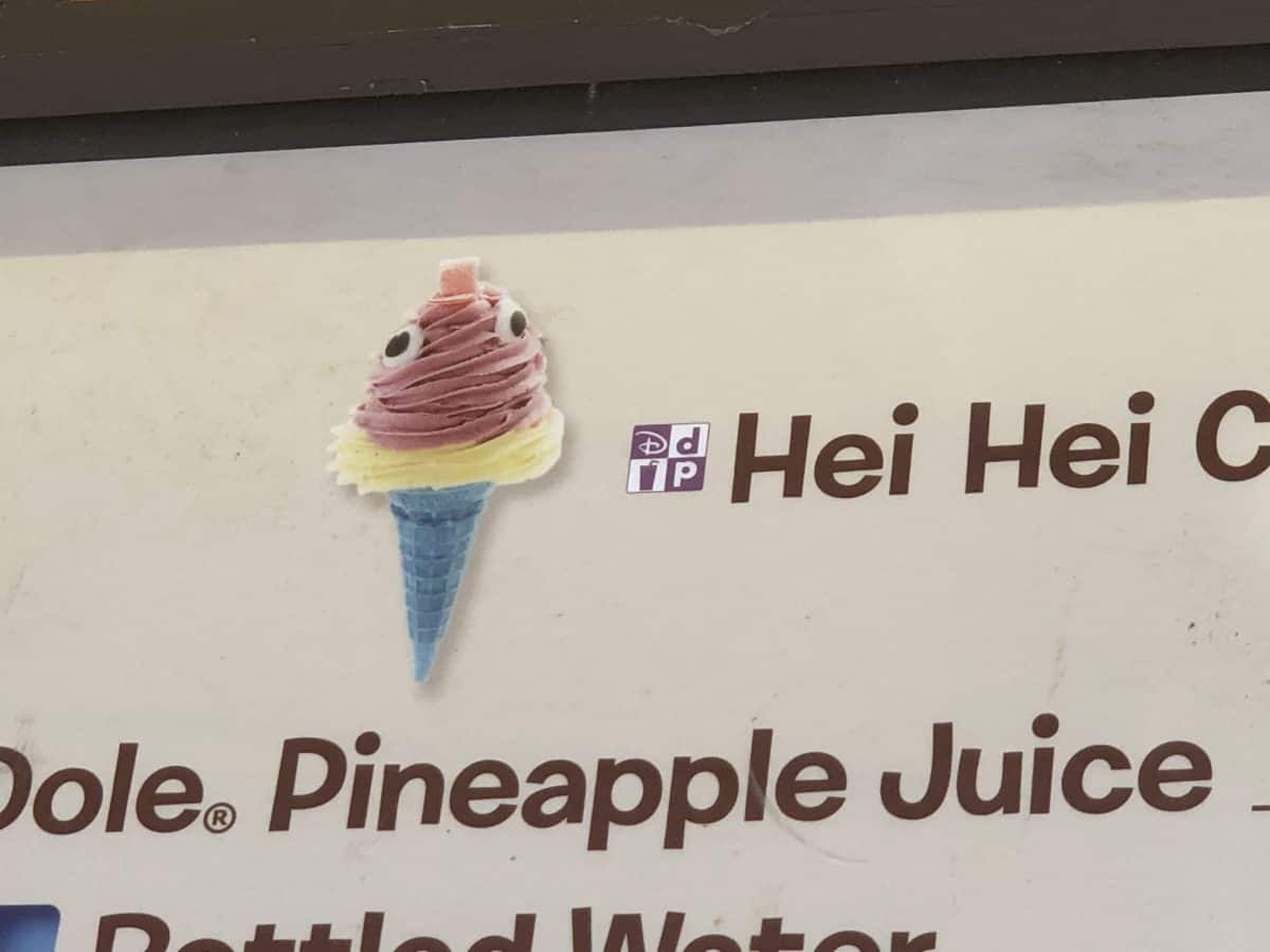 Disney describes the Hei Hei Cone as a Blue Cone filled with a layer of Pineapple Dole Whip, Raspberry Soft-serve, Sugar-Piece Eyes and a Sour Candy ‘Comb’. The cone costs $5.29.