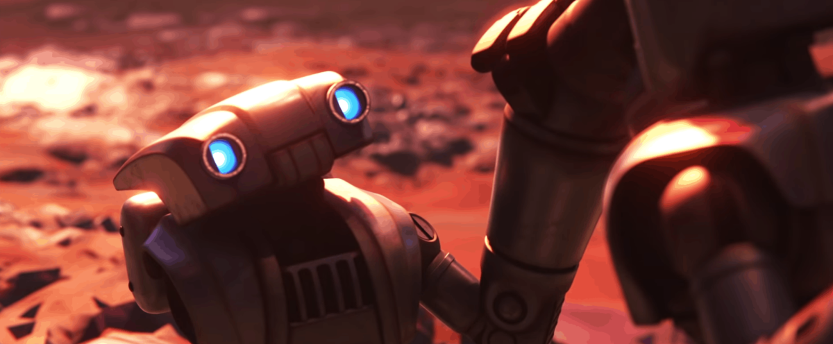According to Pixar, “Smash and Grab, directed by Brian Larsen and produced by David Lally, is about two antiquated robots who risk everything for freedom and for each other after years of toiling away inside the engine room of a towering locomotive.”