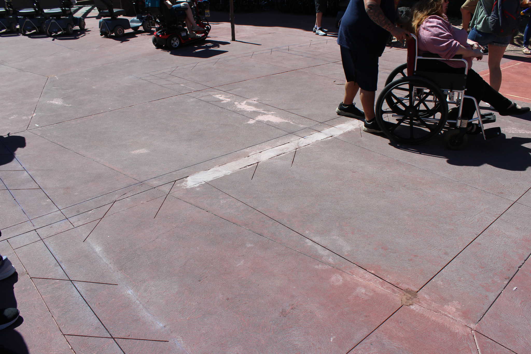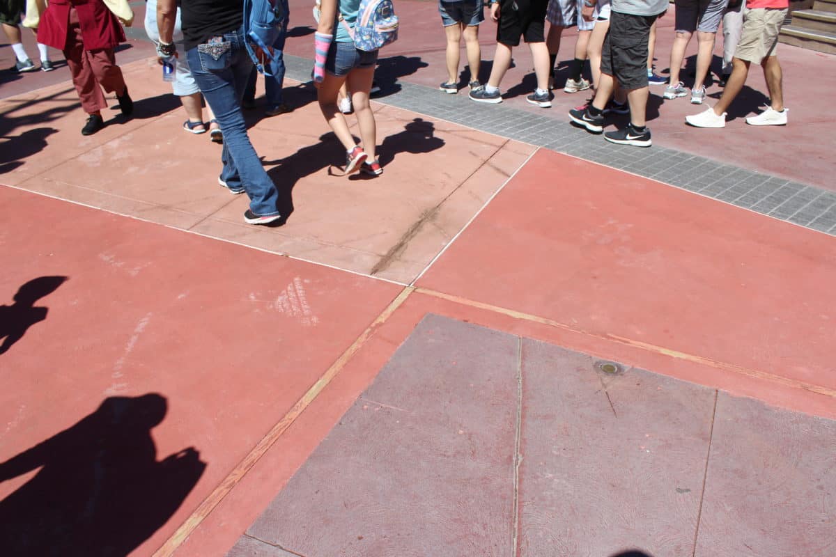 This old, worn-out concrete in Adventureland is marked to be replaced. They do this a chunk at a time. They lay it at night so it’s dry by park opening. That way, they don’t have to wall anything off.