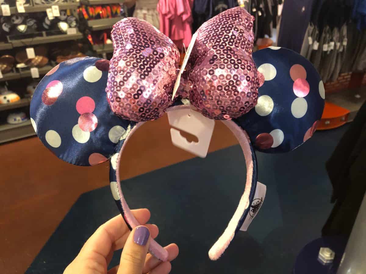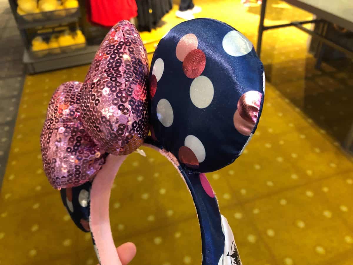 The ears feature navy blue satin with white, pink, and metallic Millennial Pink and Rose Gold polka dots. A big, puffy sequin bow makes these really stand out.