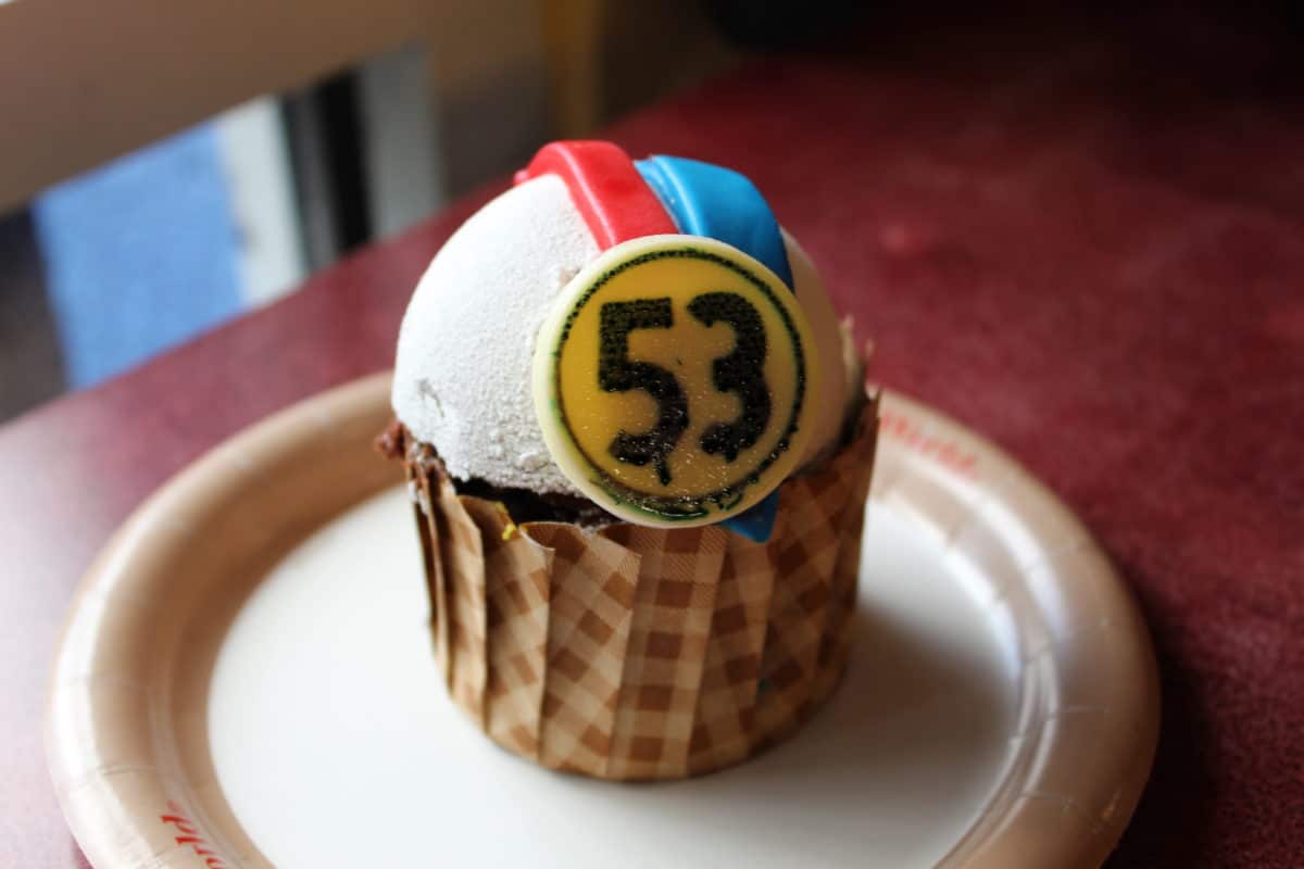 The cupcake has a white chocolate circle on the front with the classic “53”, and a red and blue fondant band. A massive portion of chocolate mousse sits on top of the chocolate-based cupcake, which is covered in powdered sugar.