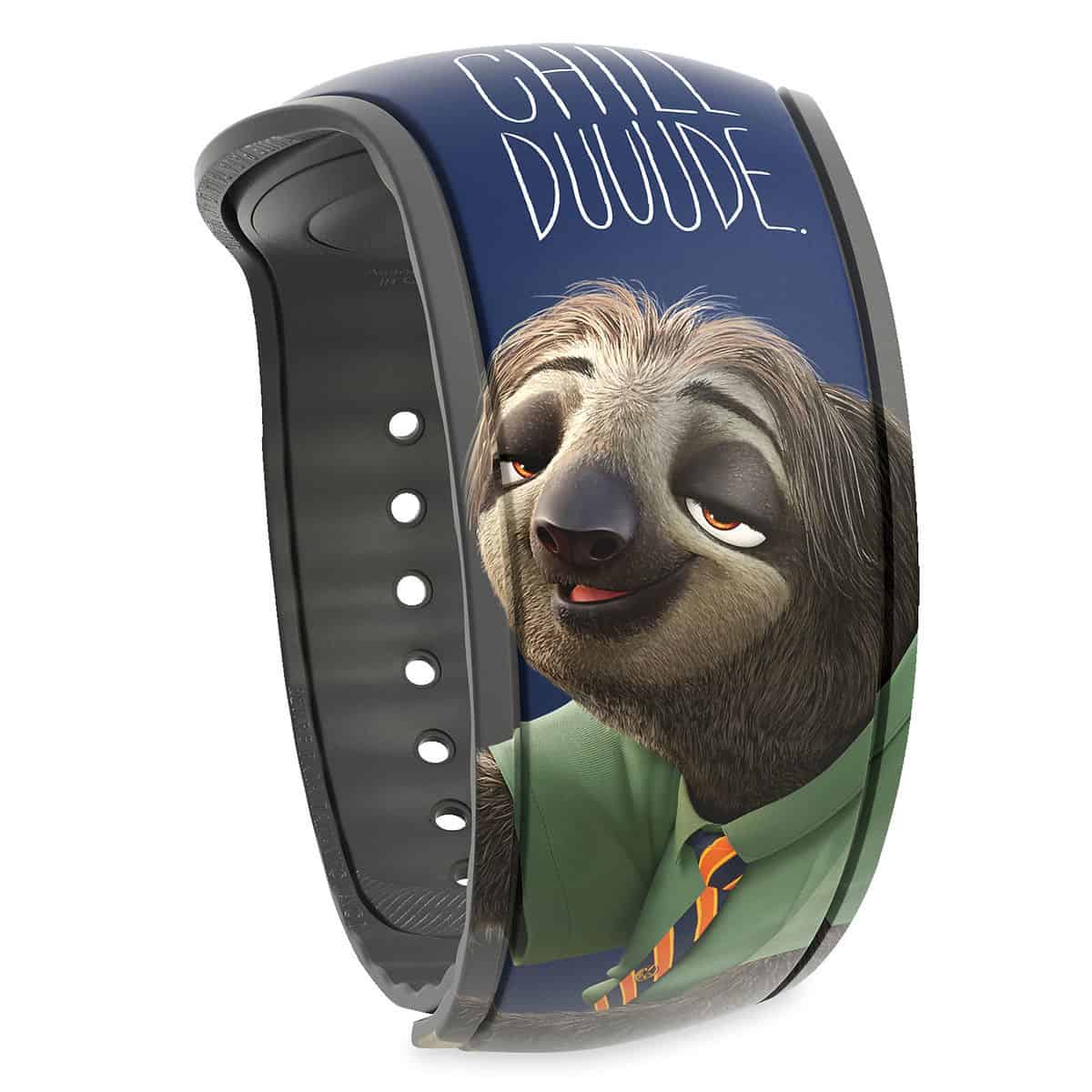 The navy blue MagicBand features Flash from the infamous DMV scene in Zootopia on one side with the words “Chill Duuude.”