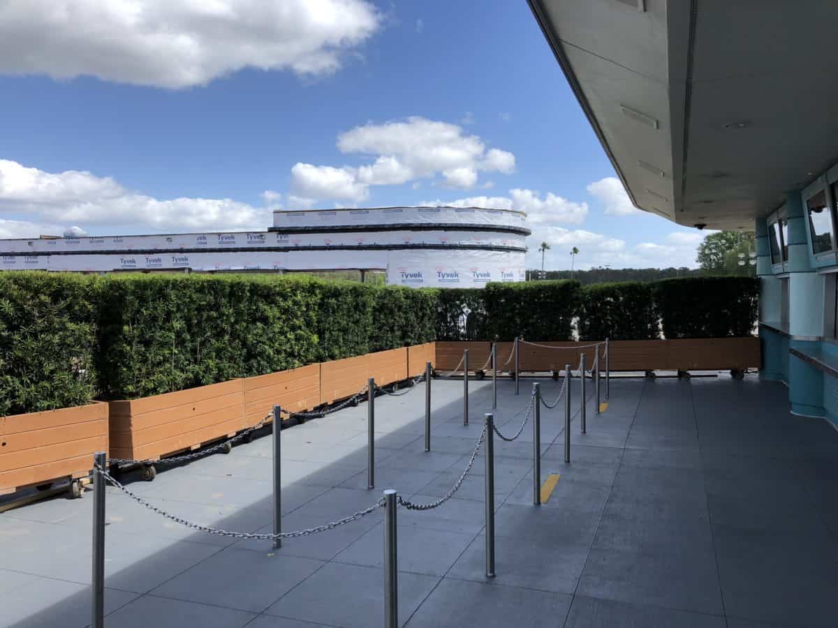Work on the new security bag check and tram loop continues outside the park. More fences have come down and been replaced with “Disney Camouflage”, aka movable bushes.