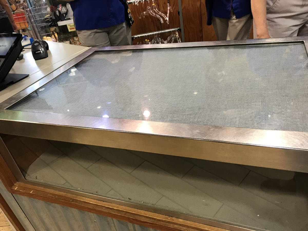 The scratched-up cases by the registers no longer hold “specialty” items and have since been blocked out with fabric.