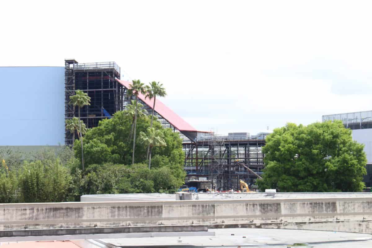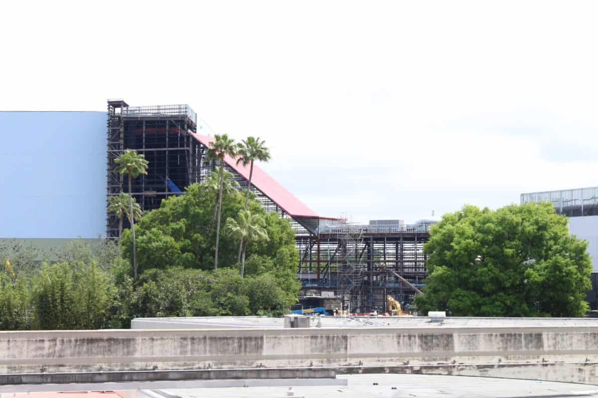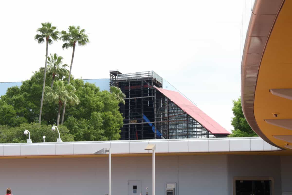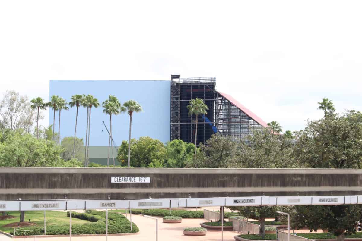 If you peer over from the Monorail station, you can get a peek at the ride track being laid inside. If you can’t tell it apart from the surrounding metal structure, it’s swathed in blue tarp.