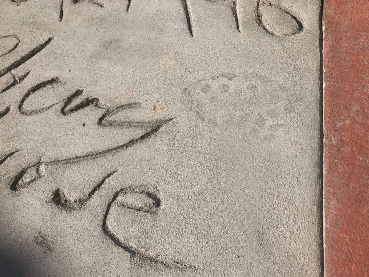 We had heard that some of the handprints had been scored outside of the Chinese Theatre. If you follow our photo reports, you’ll know that scoring is usually a sign of concrete that’s about to be removed (and replaced.) That’s why when we went over to check in on the handprints this morning…