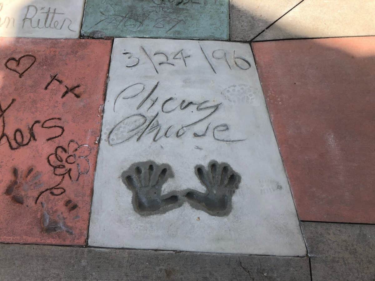 Except something had happened. A number of handprints had been re-cast and replaced, including David “It was magical!” Copperfield, Chevy Chase, and Cyd Charisse.