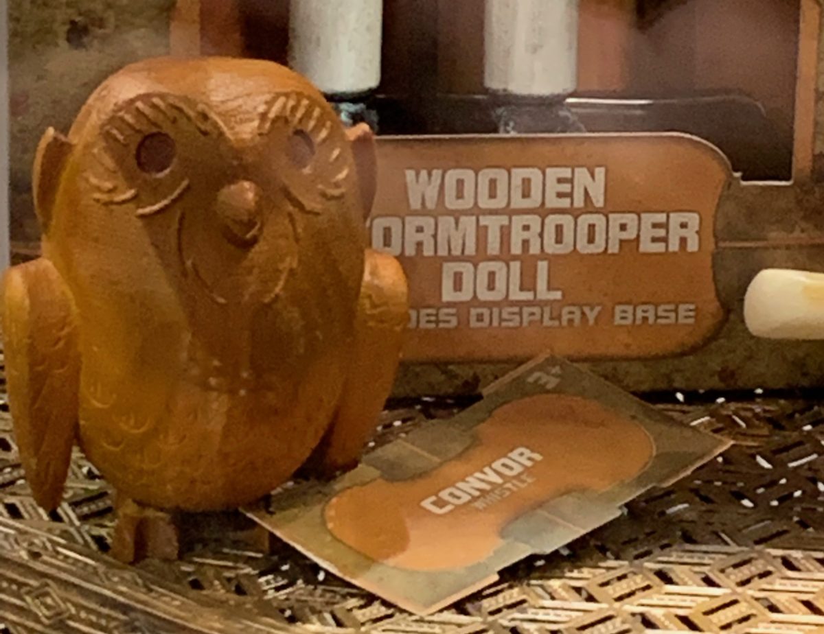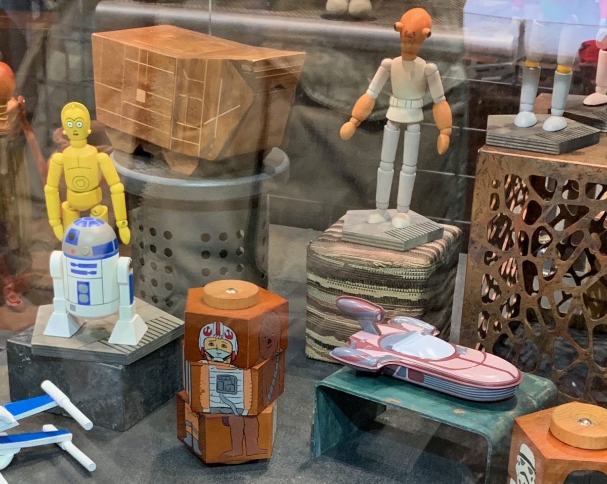 Let’s start with the Toydarian Toymaker items. There are various wooden figures on display for purchase.