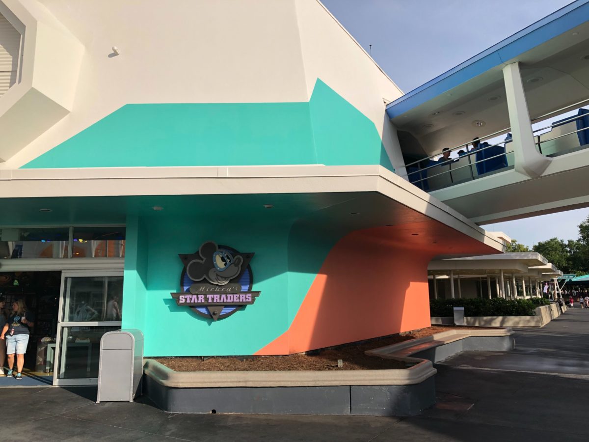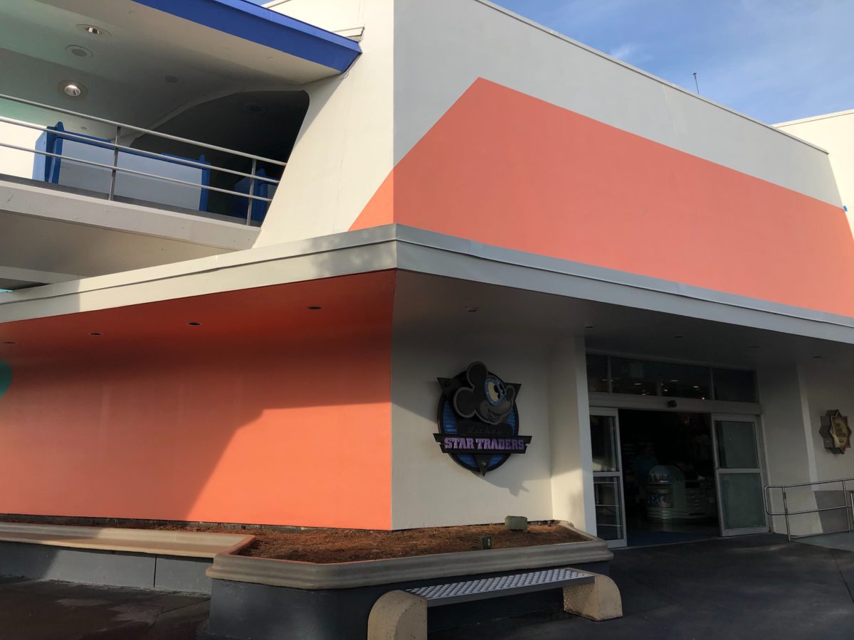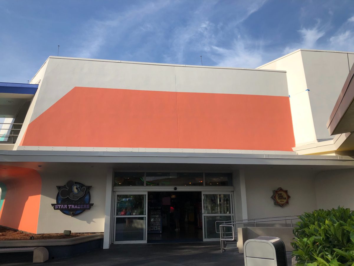 We knew something was up once we saw that this Mickey’s Star Traders wall was painted in all teal. Well, now it has a dash of peach that wraps around to the other entrance.
