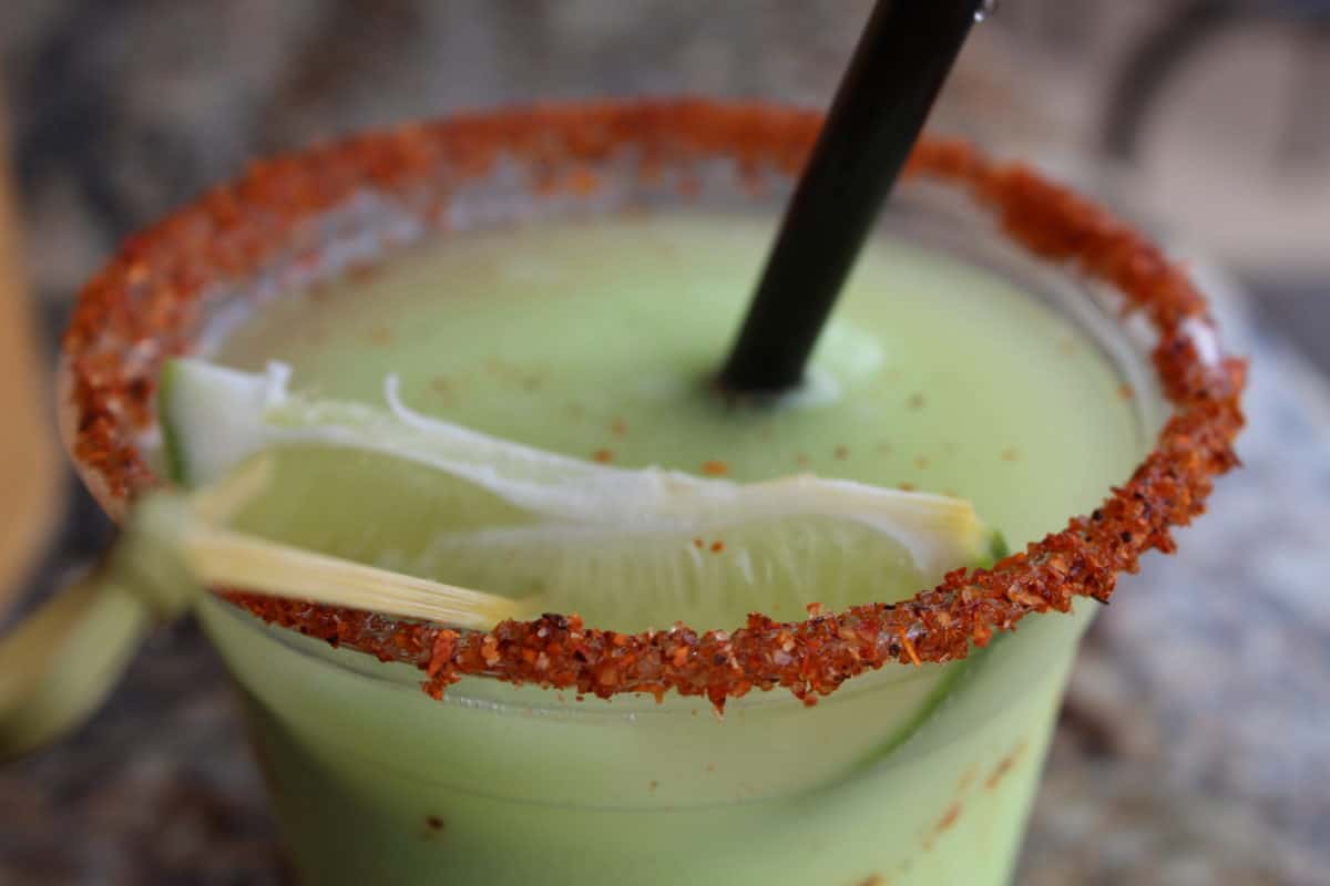 WARNING: The chili spice salt rim is very spicy! If spice in your margarita is your thing, this is an amazing drink with a little extra flavor, but if you’re more of a mild-to-no-spice type of person, I’d stick with the traditional salt garnish. Either way, the salt gets somewhat distributed throughout the drink, so expect some spice throughout.
