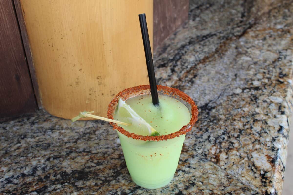 The margarita is made up of Corazon Blanco Tequila, Dole Whip Lime soft serve, and is garnished with a lime wedge. The drink comes with your choice of a salted rim or a chili spice salt rim. I decided to get adventurous with this one and went with the chili spice.