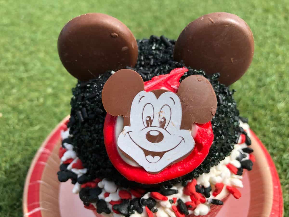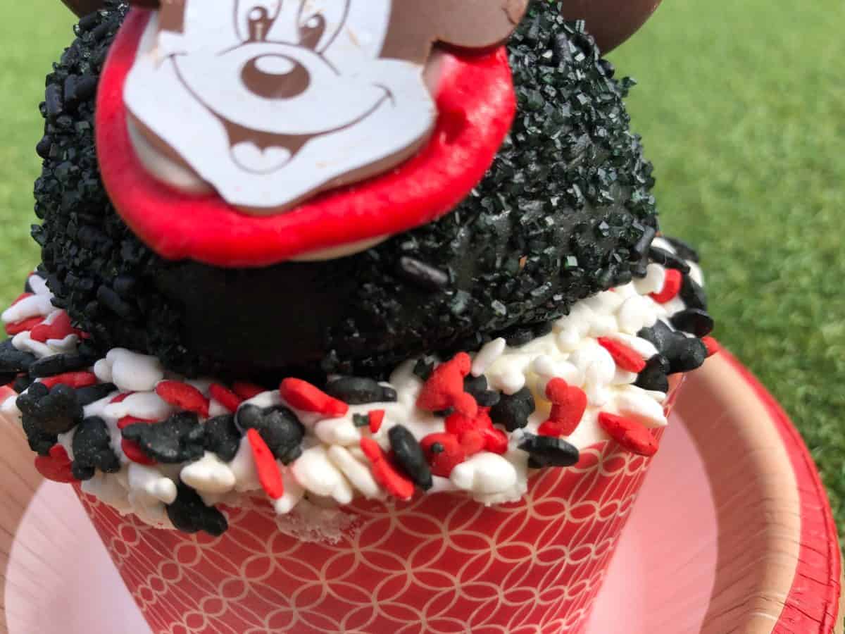 It includes red, white, and black mickey sprinkles, a Mickey head chocolate topper, and two disk-shaped chocolates on each side for ears. A dome of black frosting is covered with black pebble-like sprinkles. It all comes together to look like a Mouseketeer hat!