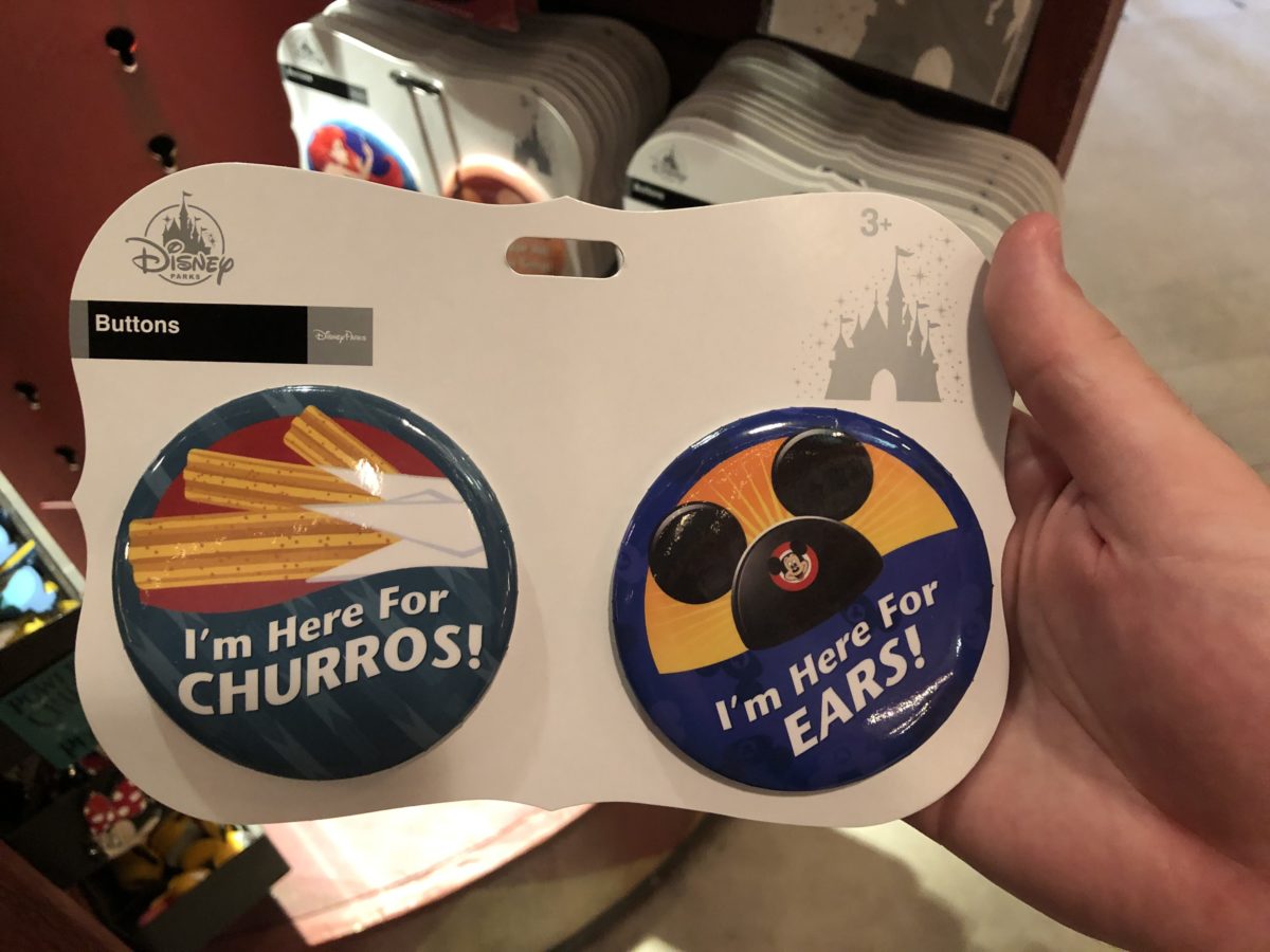 New Disney-made buttons are showing up around the parks, and this is the latest one to be spotted. This set features churros and Mickey Ear Hats. ($9.99 per set.)