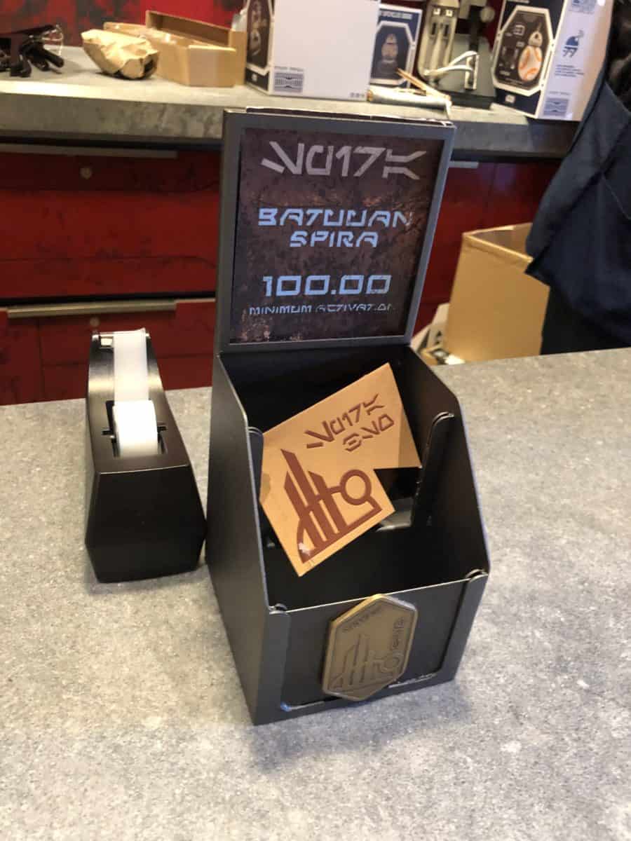 The hexagonal coin features a Black Spire logo and the words in “BSO” (for Black Spire Outpost) and “Spira” in Aurebesh. The weathered antique gold coin looks like it’s been traded around the galaxy and back, but now it can be yours by just loading it with a balance of $100 in gift card credit.