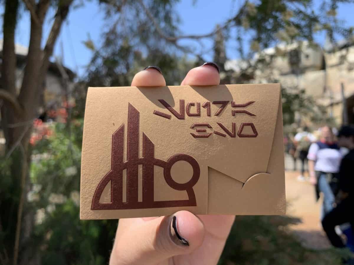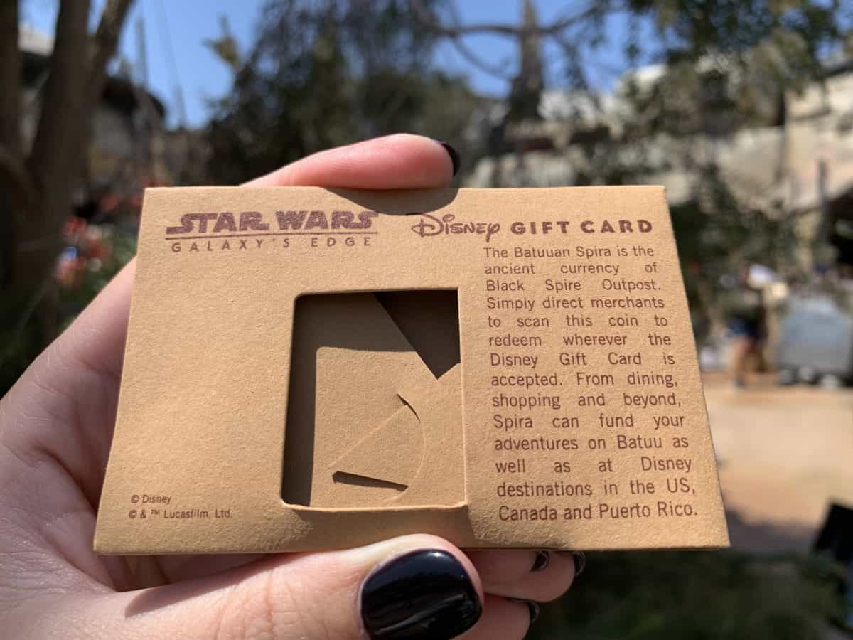We’ve seen a number of cool, out-of-this-world things throughout the opening of Star Wars: Galaxy’s Edge at Disneyland, but this find really takes the Batuu-bon cake. Presenting the Galaxy’s Edge “Batuuan Spira” gift card: