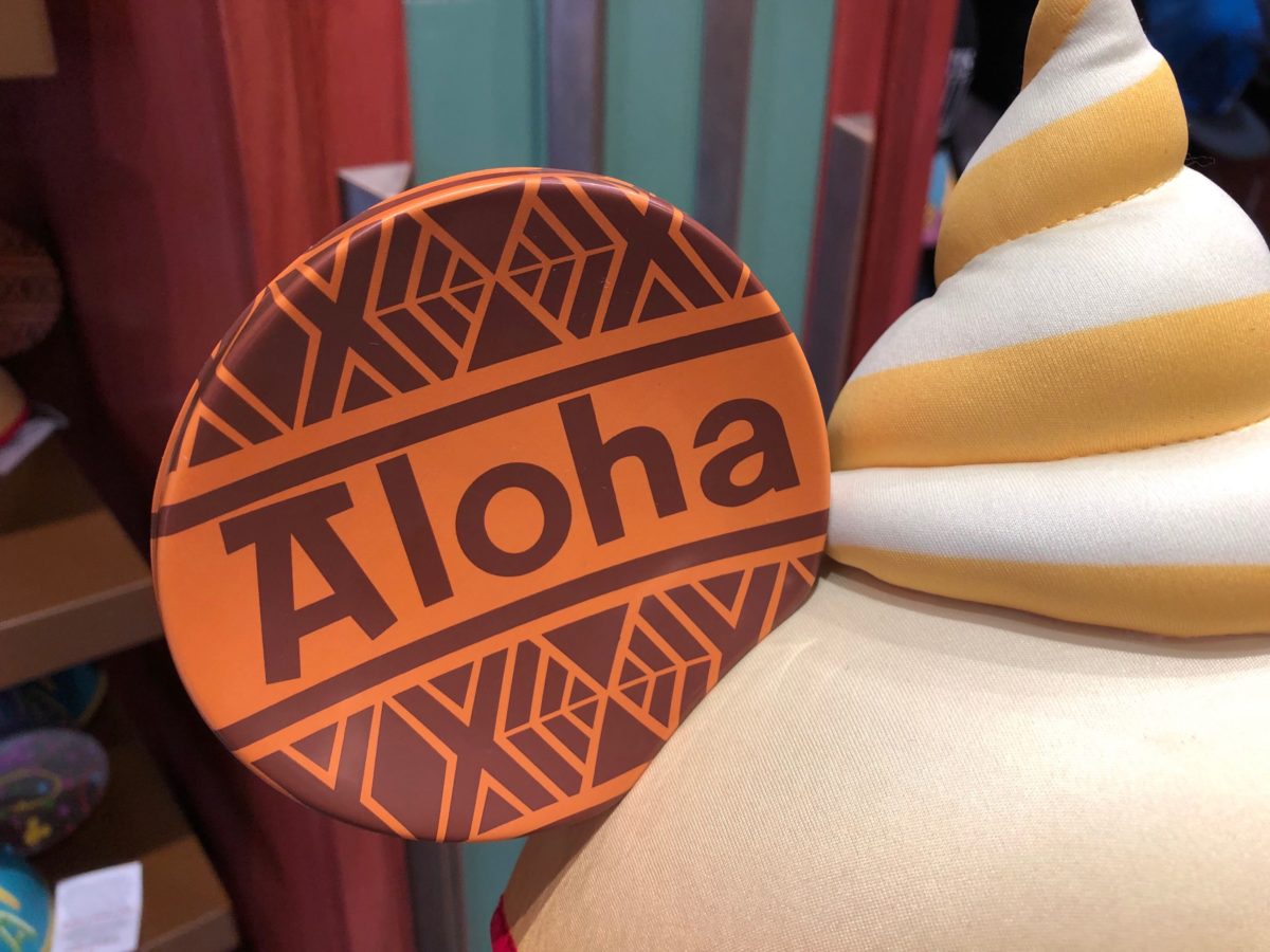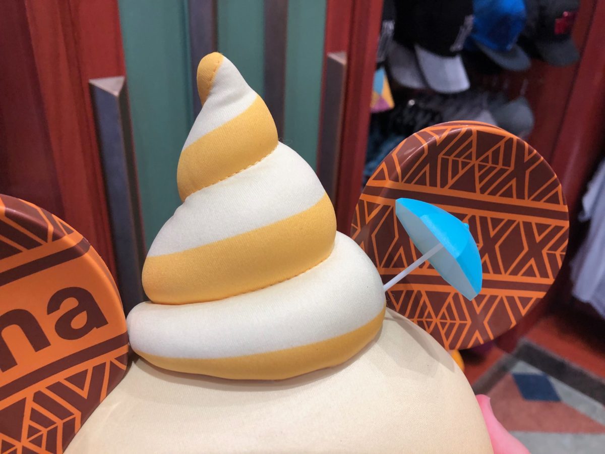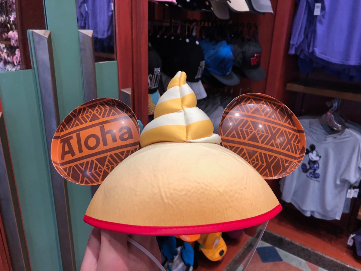 The hat’s topped with a swirl of Citrus Swirl (our reporters joke that this looks awfully similar to a particular emoji.) The ears feature Polynesian designs with the words “Aloha” on one ear and another plain patterned ear.