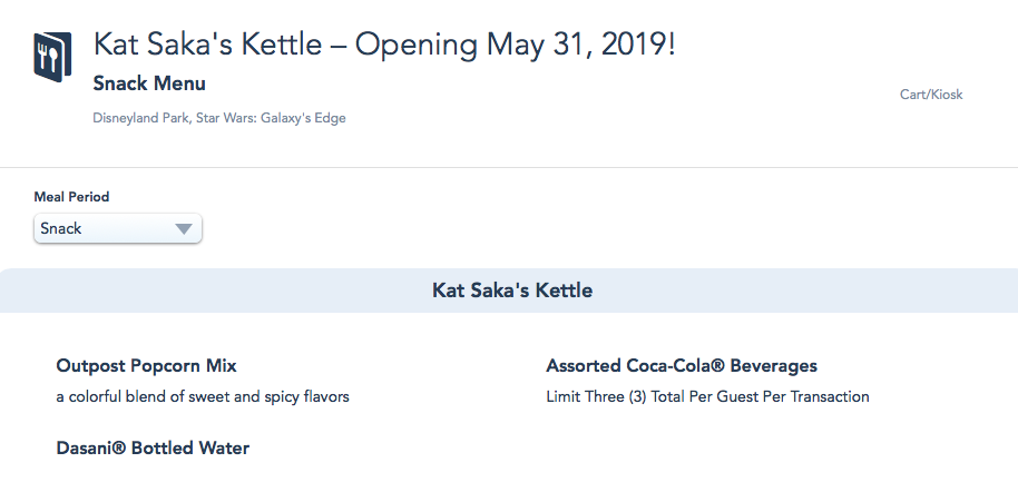 Disneyland has been working fast, populating online menus for all Galaxy’s Edge eateries as we near the opening of the land, and the menu for Kat Saka’s Kettle has recently been updated as well: