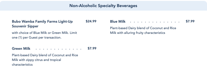Currently, the online menus list the usual Blue and Green Milk, priced at $7.99 each serving, plus the Bubo Wamba Family Farms Light-Up Souvenir Sipper for $24.99.