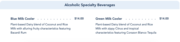However, at the bottom of the menu, you see the option for the new Alcoholic Specialty Beverages: the Blue Milk Cooler and the Green Milk Cooler, both priced at $14.00. The Blue Milk sees the addition of Bacardi Rum, whereas the Green Milk sees the addition of Corazon Blanco Tequila.