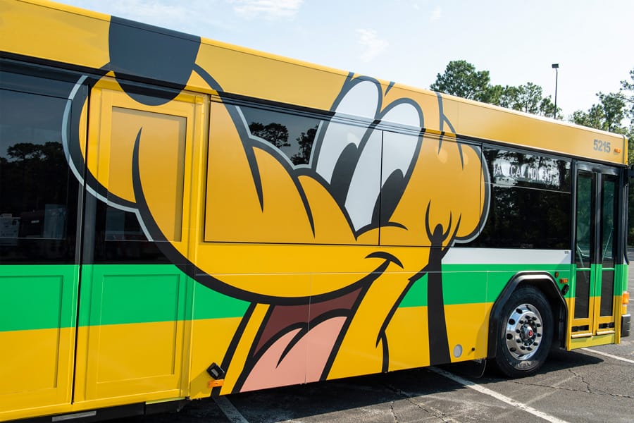 Well, it is official. New Disney Transport “Sensational Six” buses will be hitting the roads of Walt Disney World starting this month. These new buses feature the likenesses of Mickey, Minnie, Donald, Daisy, Goofy, and Pluto.