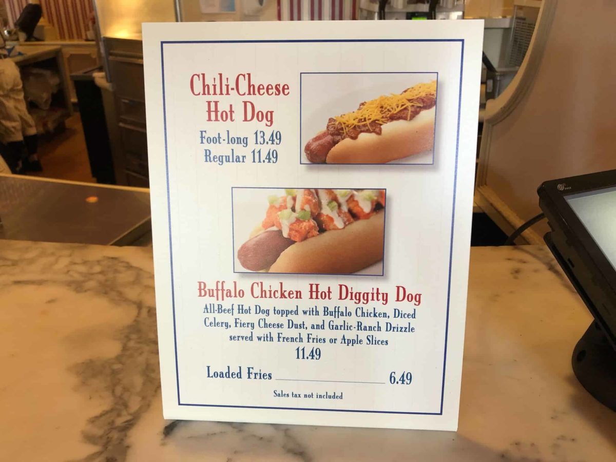 When we stopped by Casey’s Corner this morning, we noticed the sign on the counter advertising the new Buffalo Chicken Hot Diggity Dog of the month. We also spotted an advertisement for the Chili-Cheese hot dog… and an option for the foot long! They’ve brought back the choice of foot long or regular hot dogs again. A regular dog will cost you $11.49, while the foot long dog will run you $13.94. This is great news.