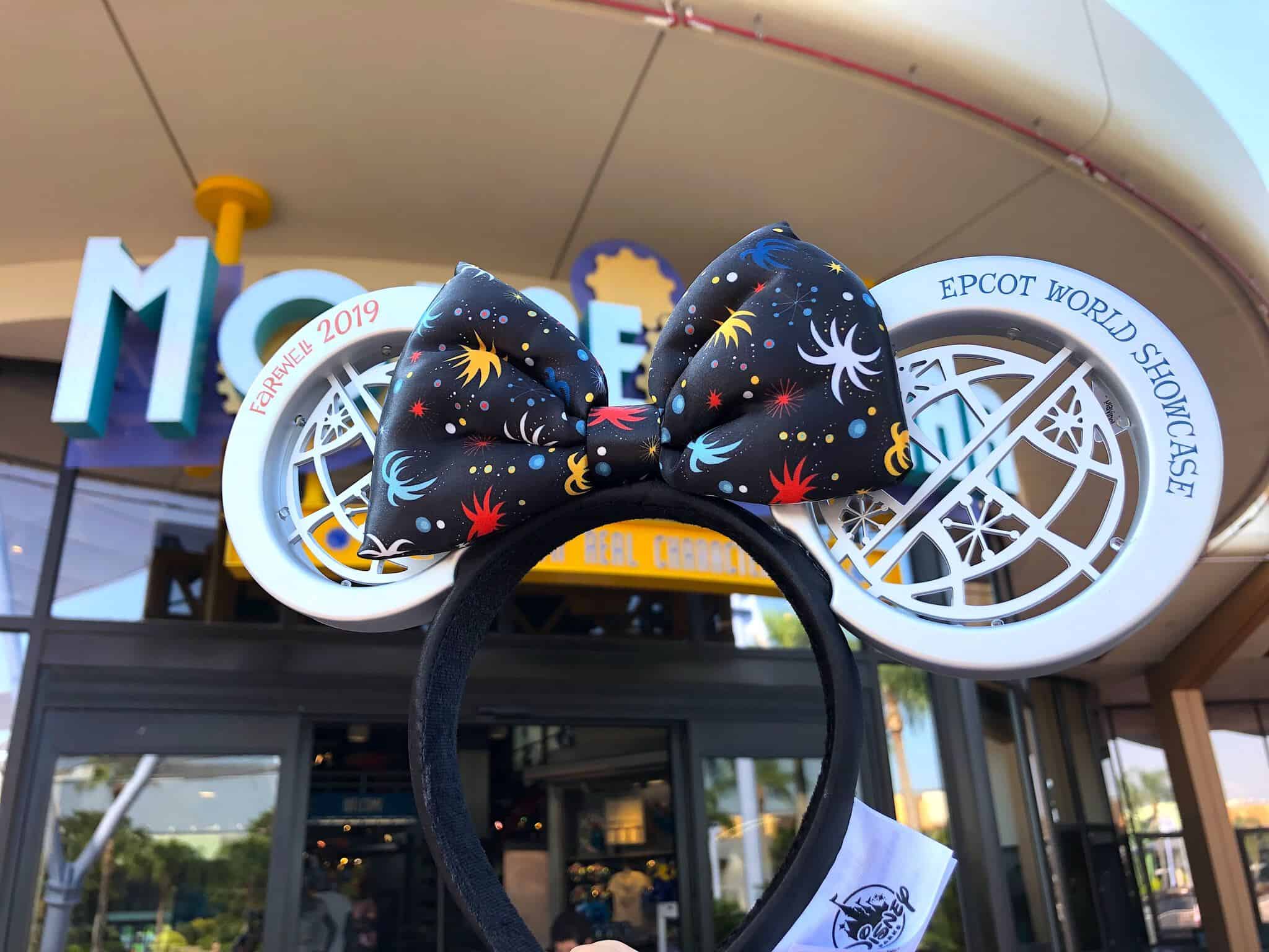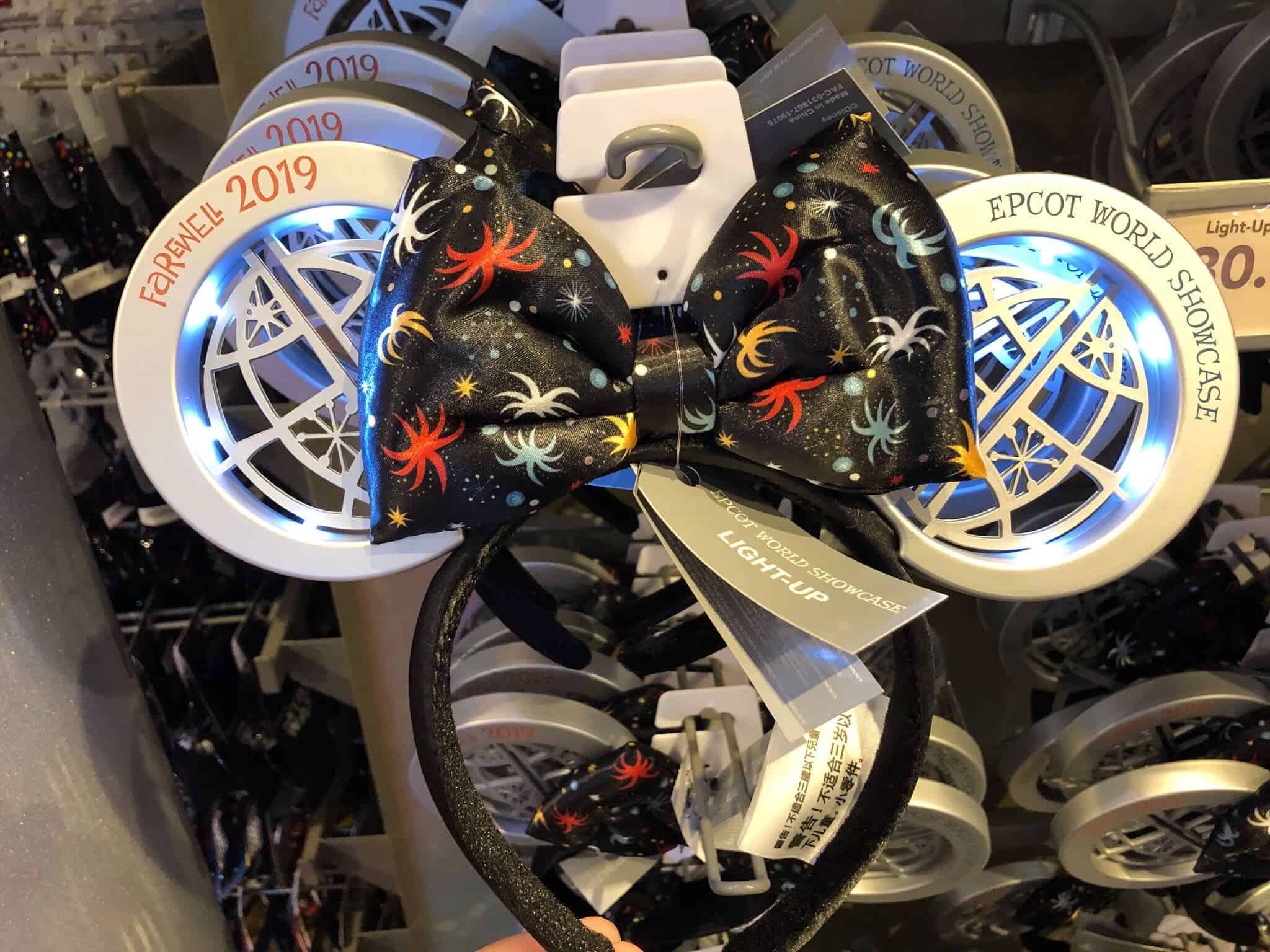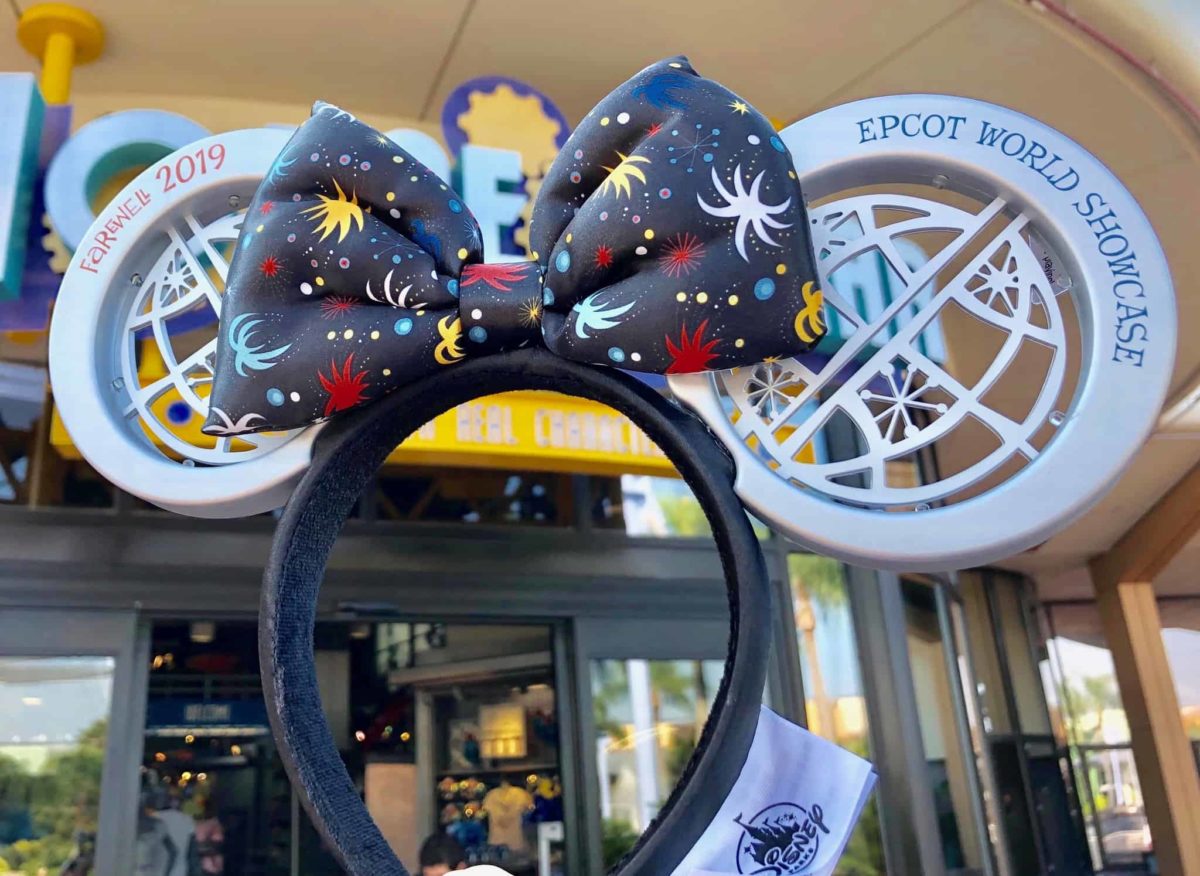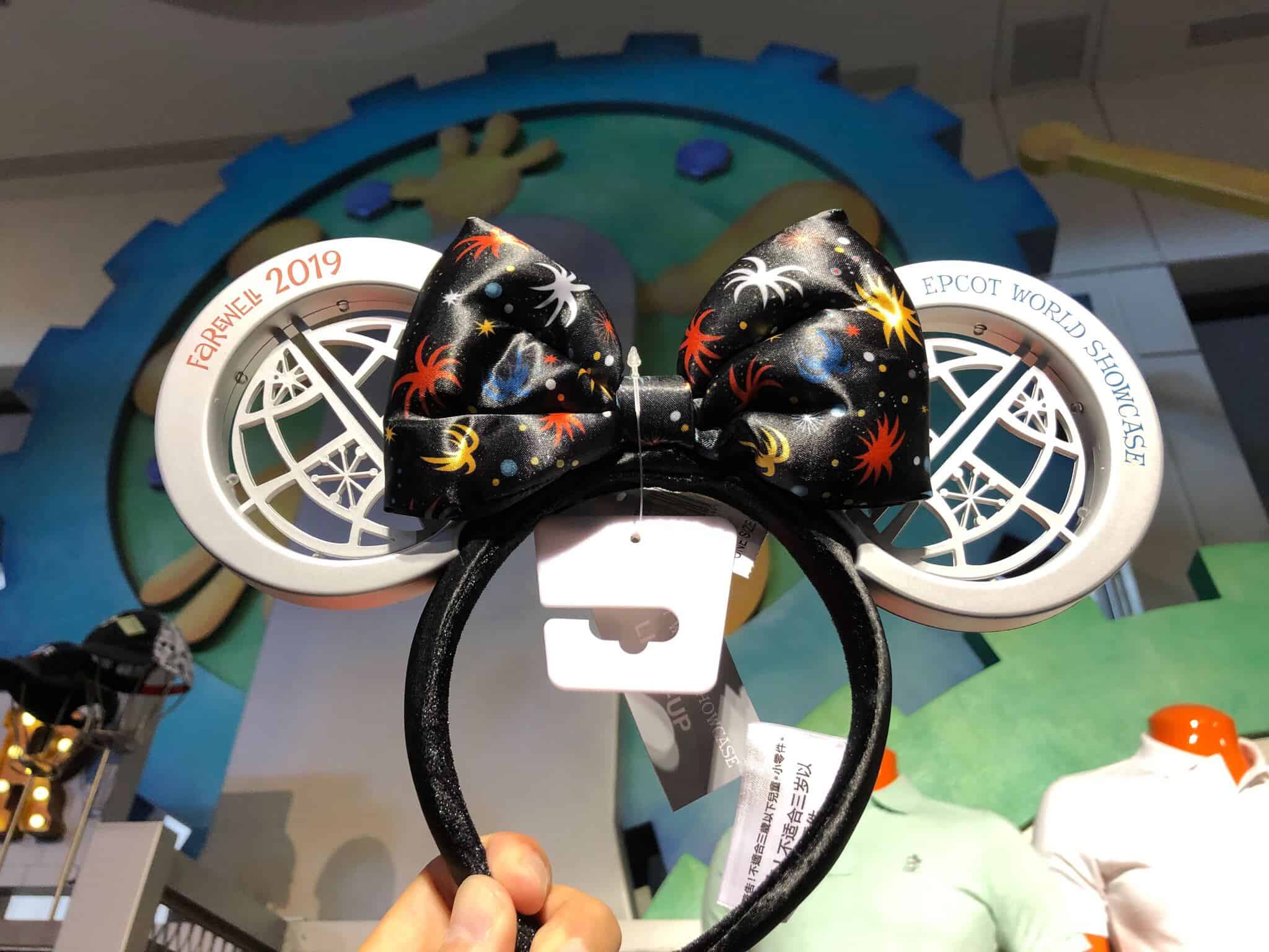 The ears feature a satin bow with a similar fireworks print that was used in the rest of the collection, with plastic sculpted ears made to look like the Earth Globe. One ear says “Farewell 2019” and the other says “Epcot World Showcase”. The headband itself is lined with black satin on the outside and black velvet on the inside, to keep things comfortable.
