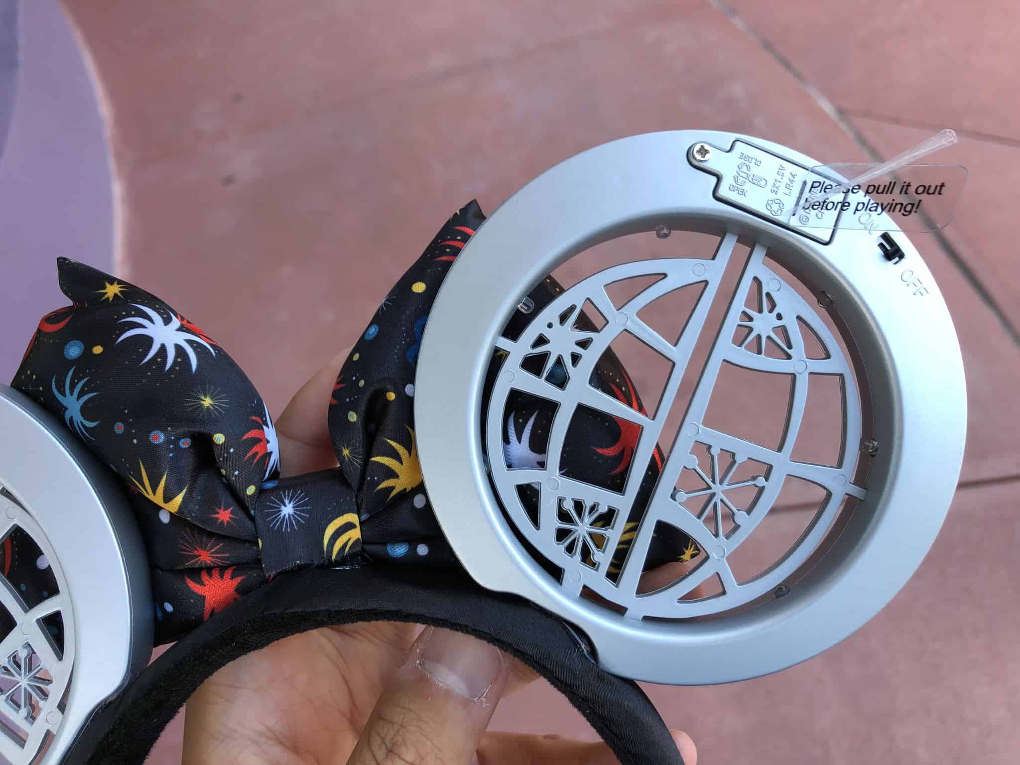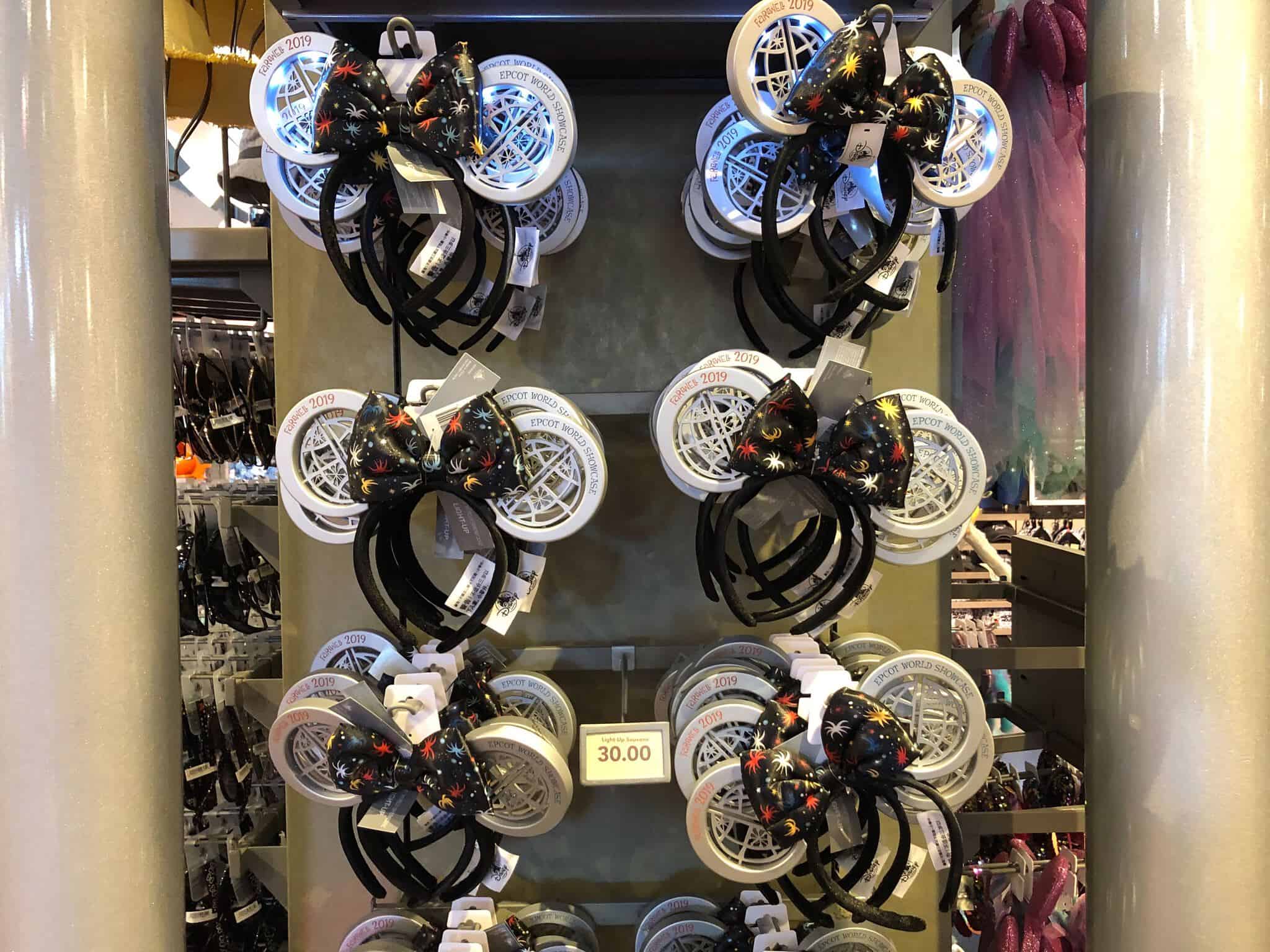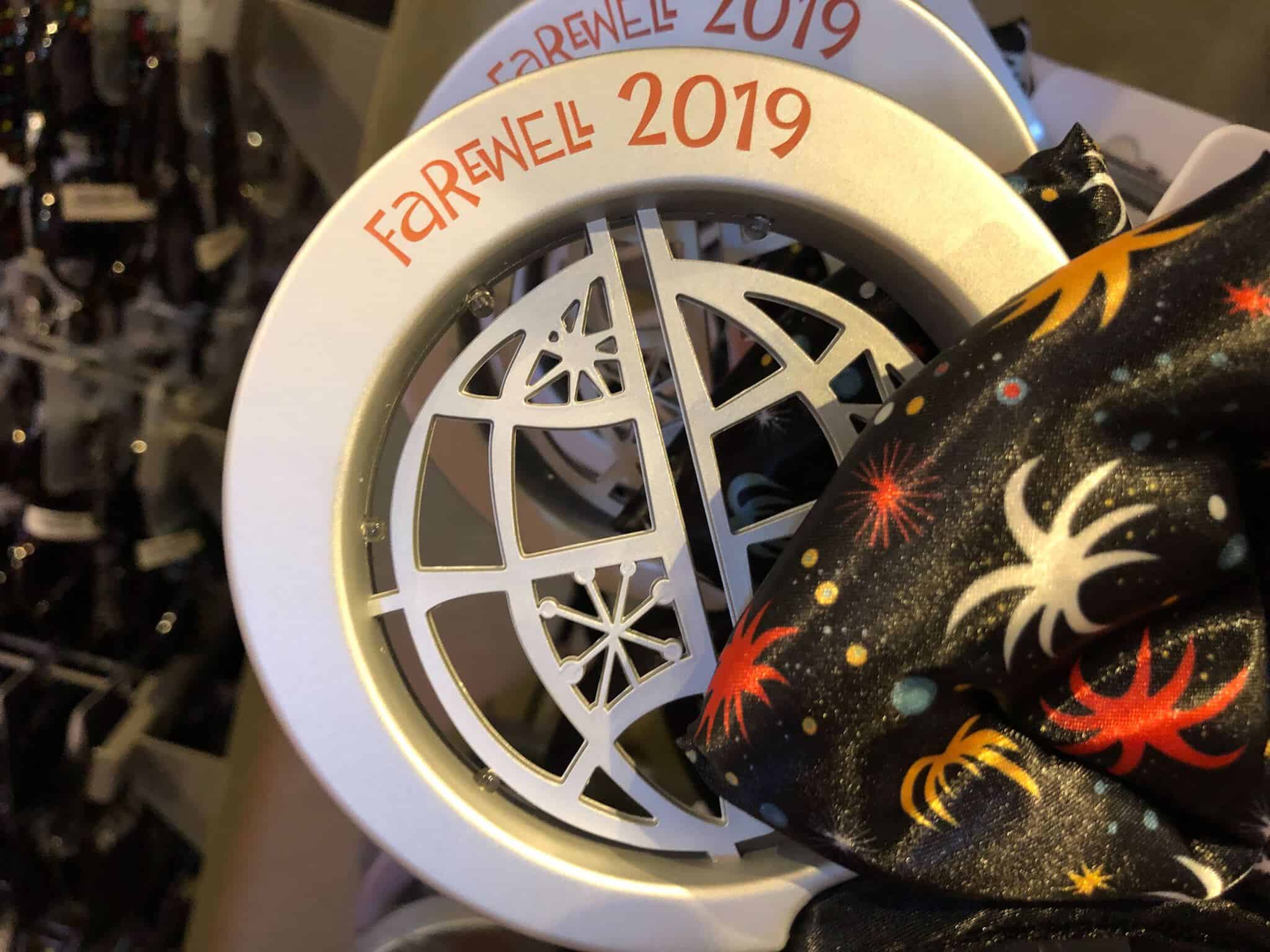 The ears feature a satin bow with a similar fireworks print that was used in the rest of the collection, with plastic sculpted ears made to look like the Earth Globe. One ear says “Farewell 2019” and the other says “Epcot World Showcase”. The headband itself is lined with black satin on the outside and black velvet on the inside, to keep things comfortable.