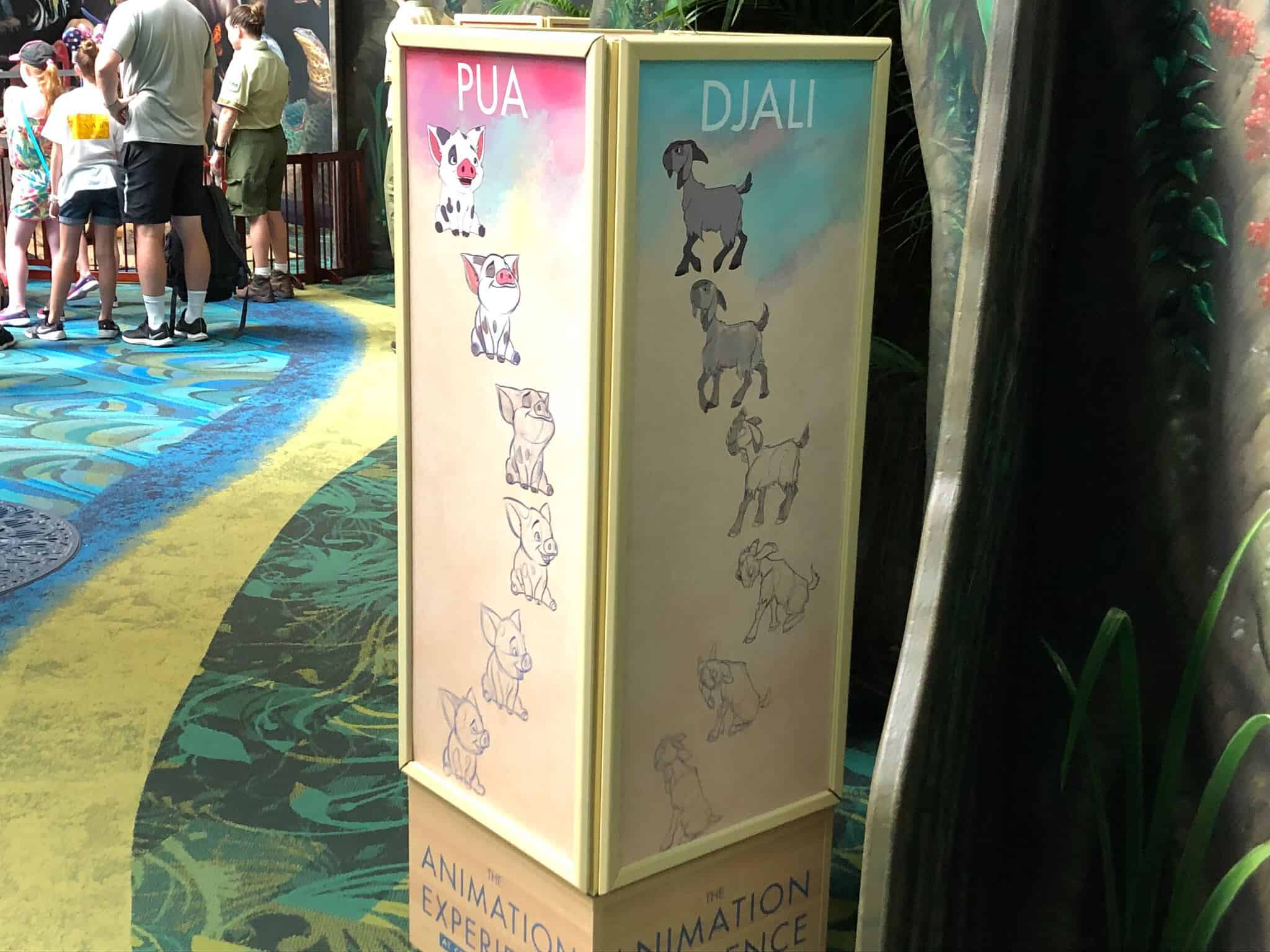 Various podiums show off some of the characters that will be on rotation for the experience, like Pua and Djali. For now until the premiere of The Lion King, the experience will solely rotate amongst various Lion King characters.