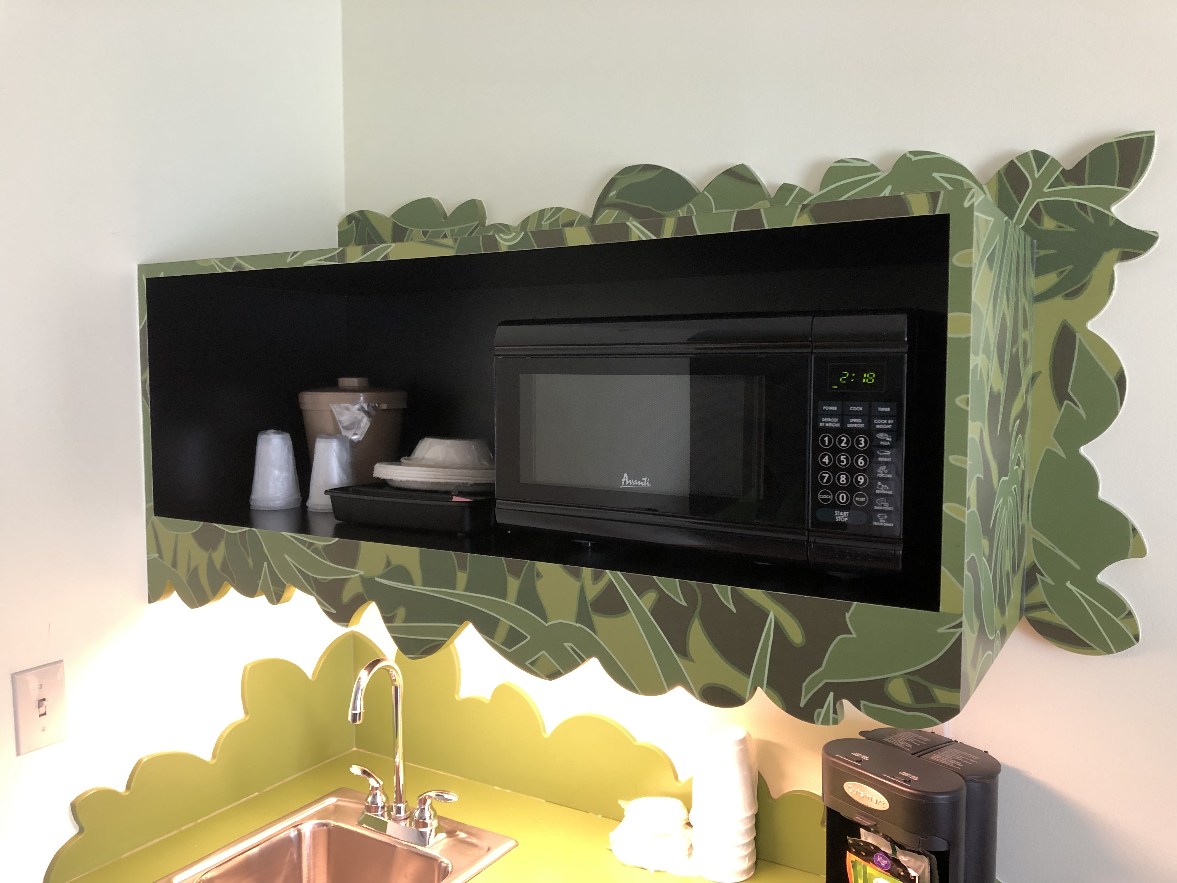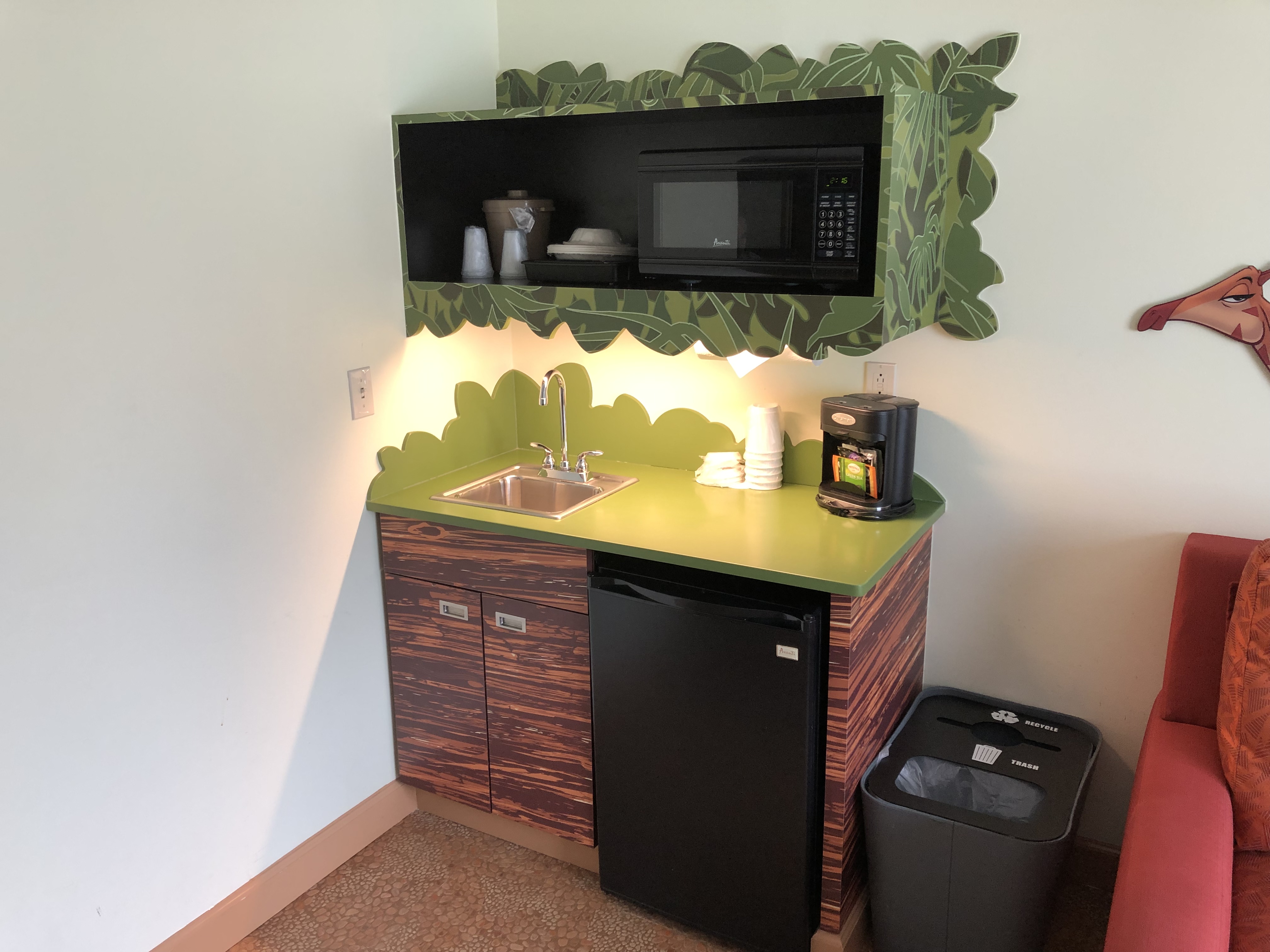 The room has a microwave, a coffee maker, and a mini fridge. There’s also a sink.