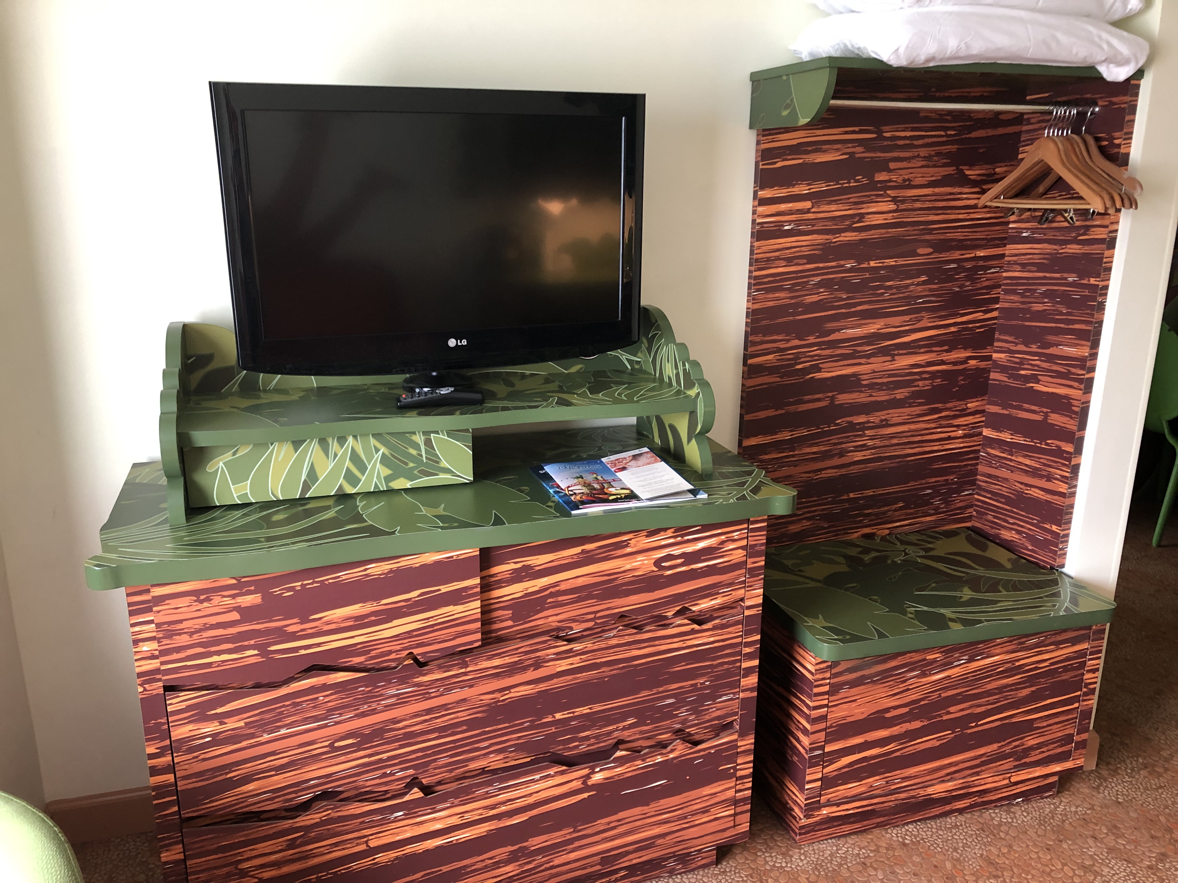 The main bedroom has more Lion King details. There’s a TV, dresser, iron, and safe in the main room.