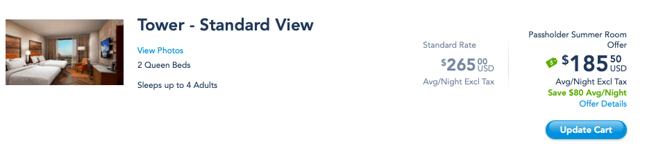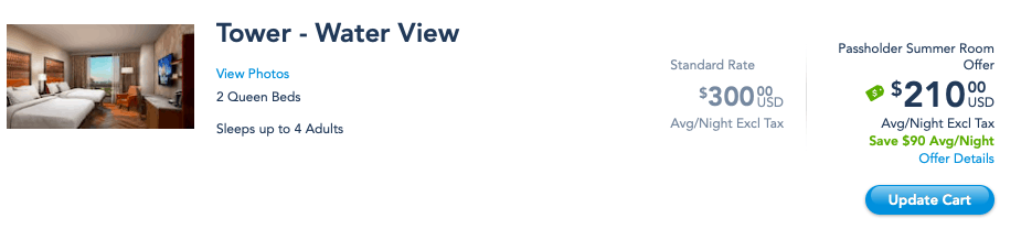 Here’s an example of price differences among Standard Coronado rooms, Standard Tower rooms, and Water View Tower rooms: