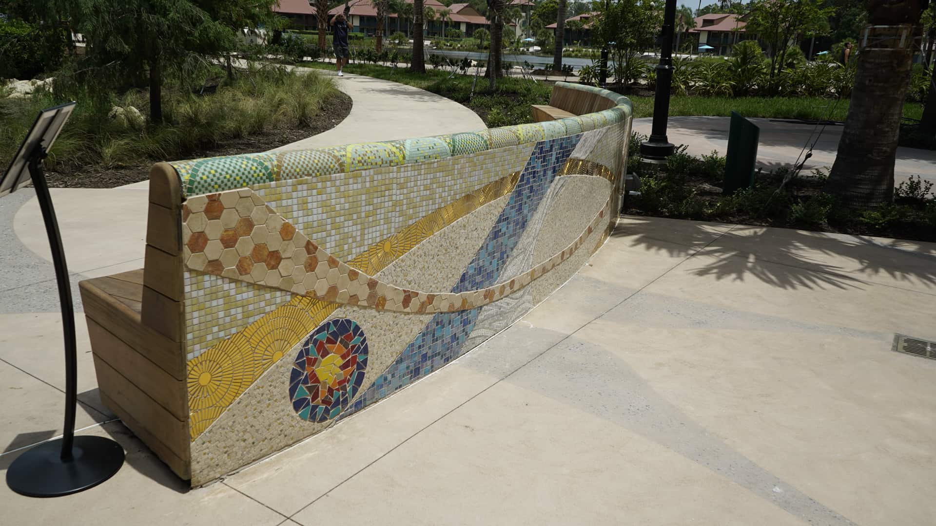 A series of mosaic-wrapped wooden benches face the magnificent Lago Dorado.