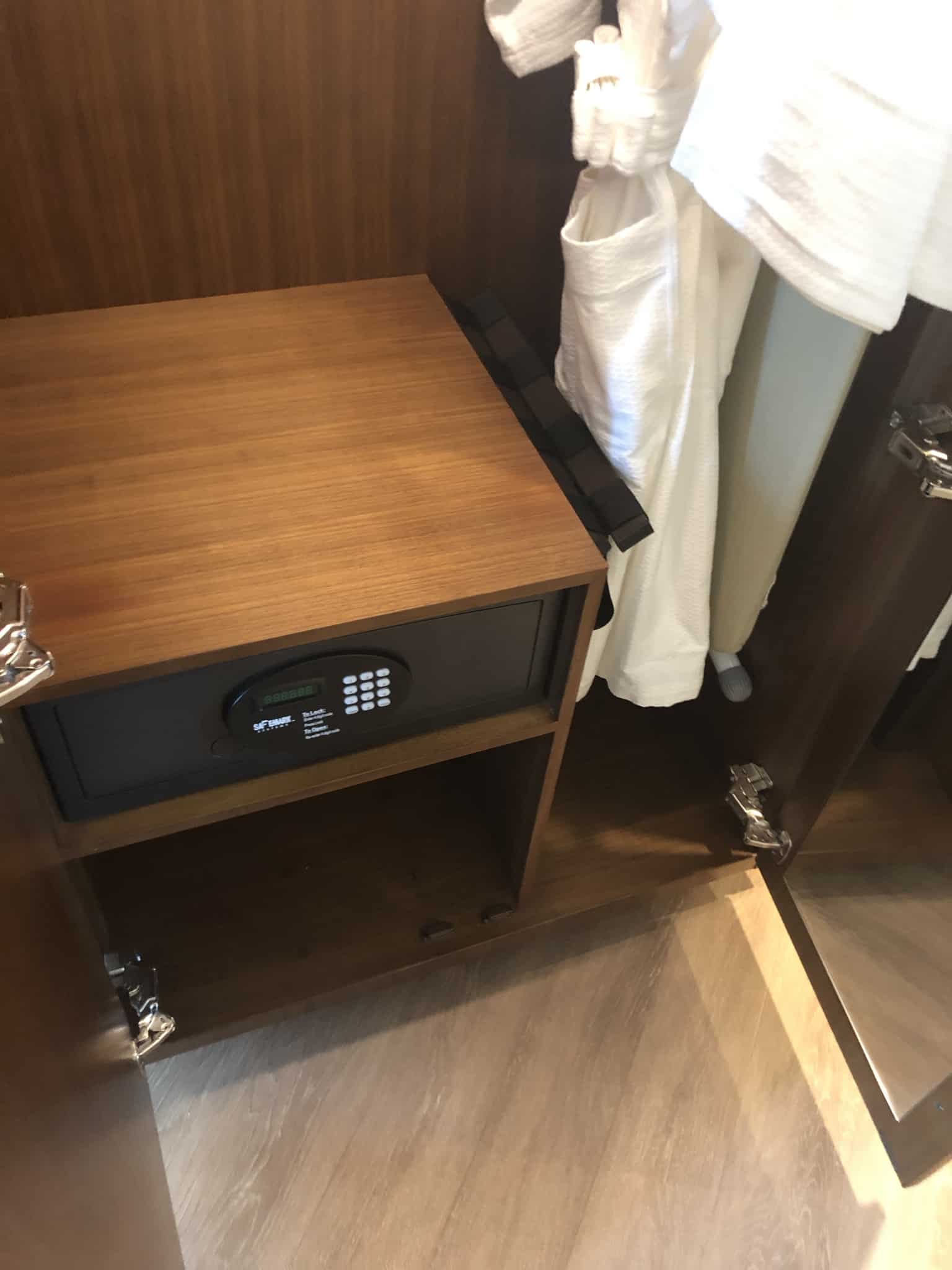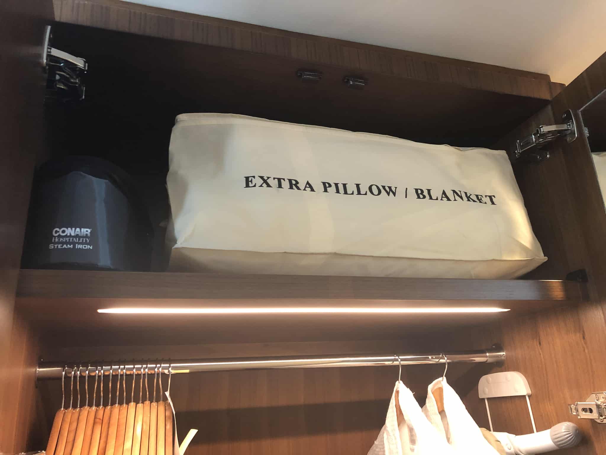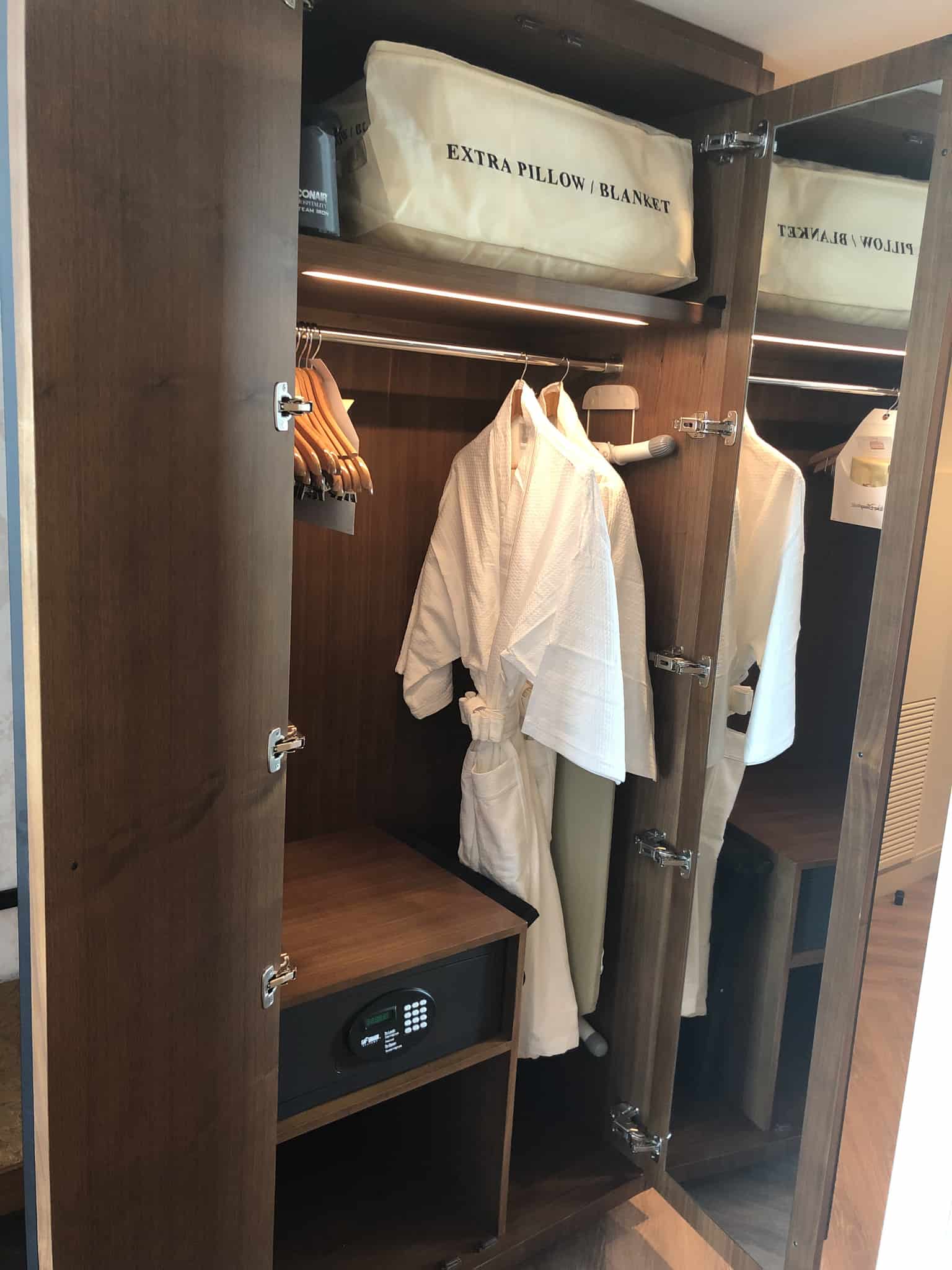 A closet houses a safety box, steam iron and ironing board, wood hangers, and some extra pillows and blankets. All Club Level guests get a set of robes to wear around the room. (You can always request more if you need them.)