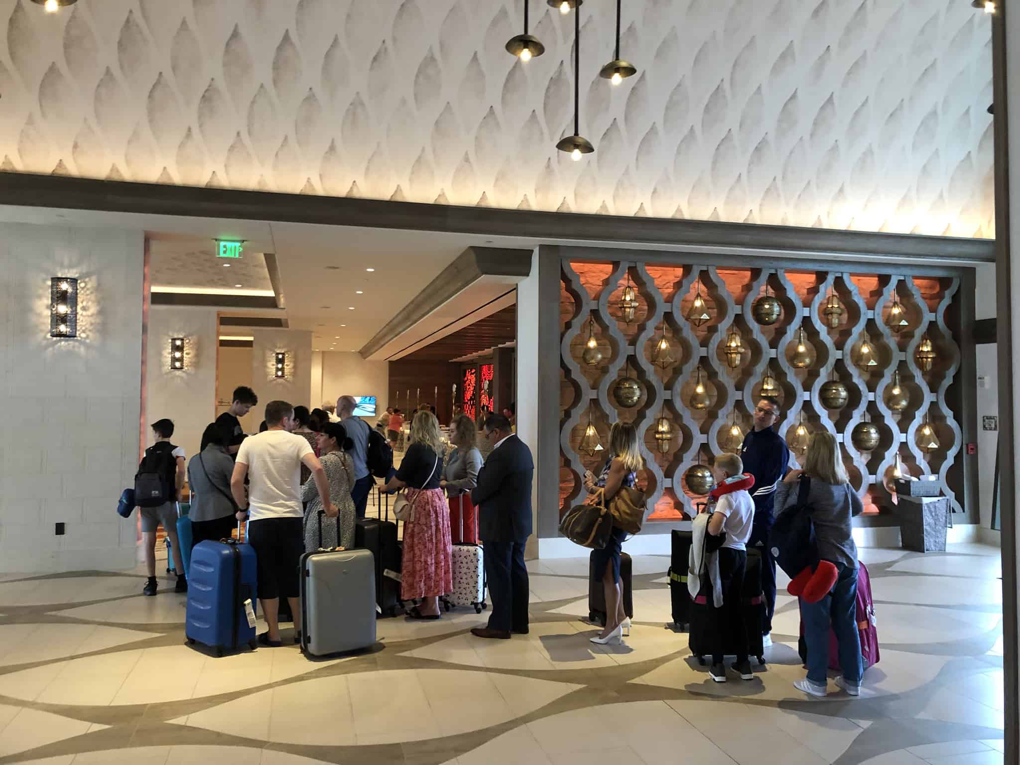 There are traditional check-in counters, but depending on how busy it is once you arrive, you’re ideally whisked away by a Cast Member with an iPad to check you in at any one of the plush seating areas across the upper-level lobby.